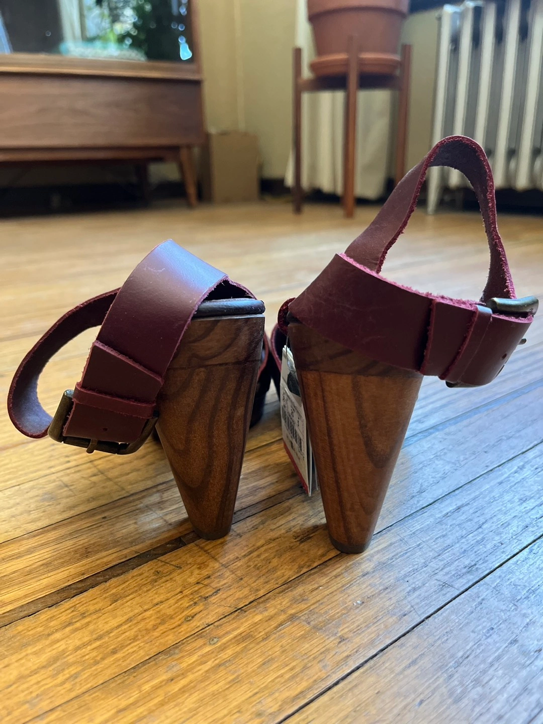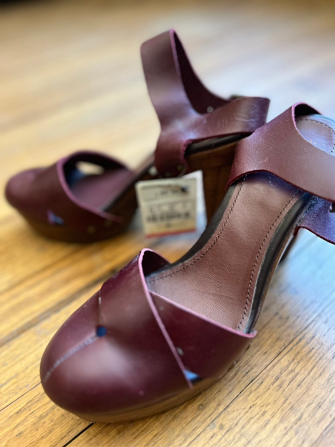 - Leather uppers and wood heels