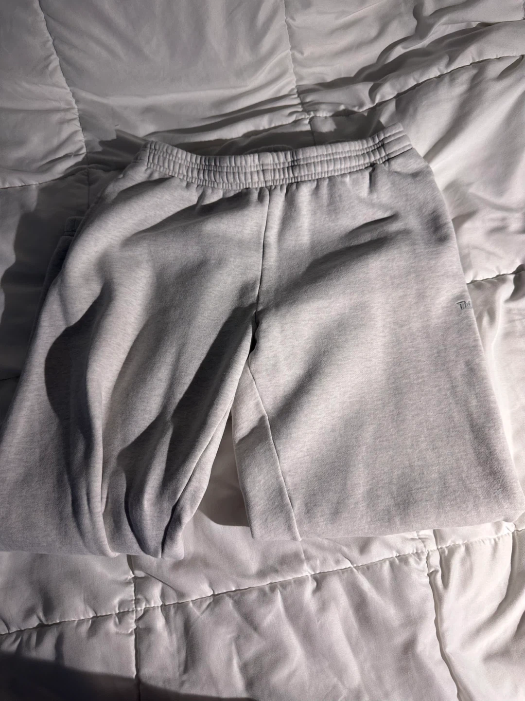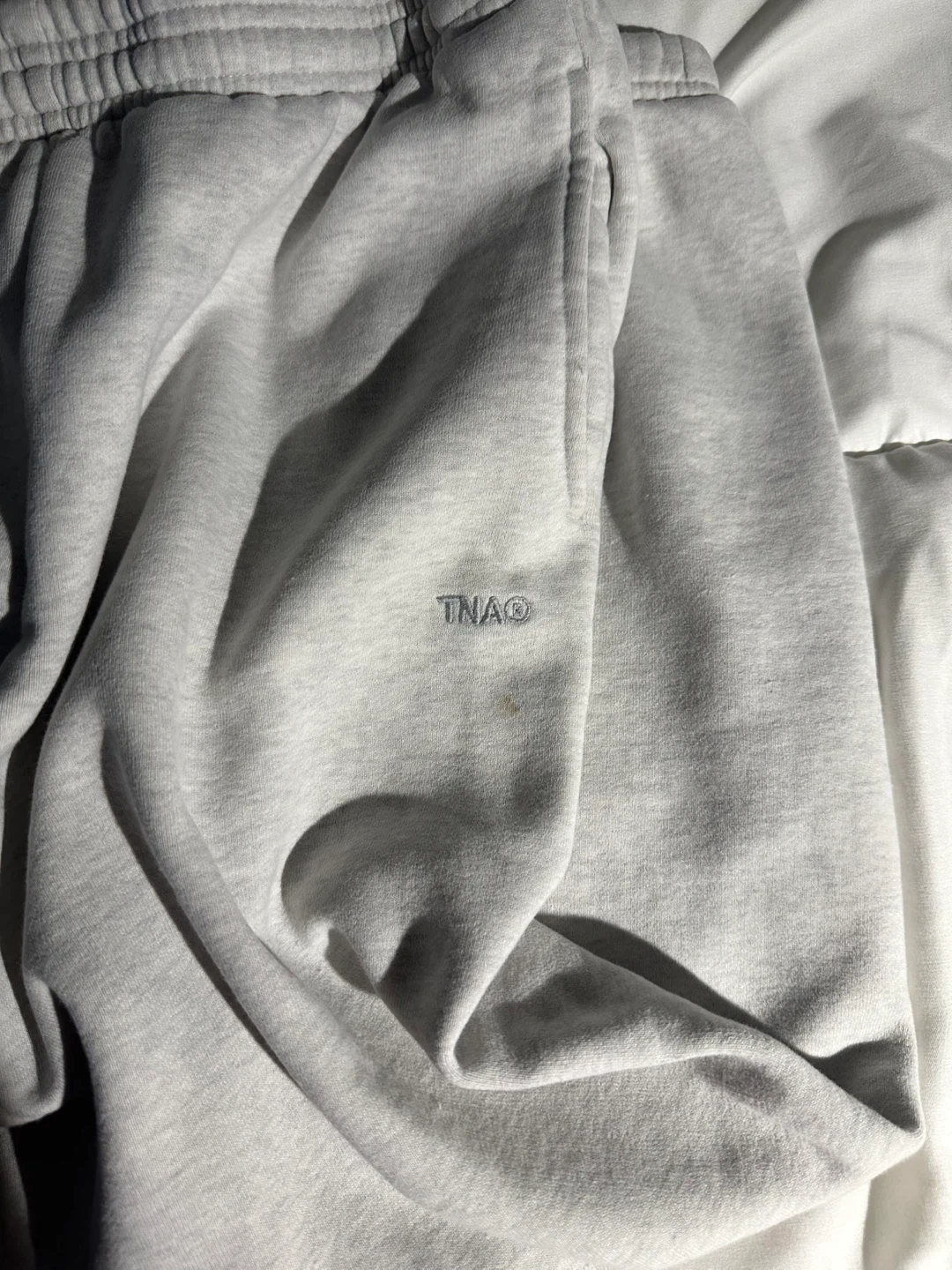 Selling a pair of comfy TNA aritzia sweatpants in a light grey colour. They're a size small and made of a soft material.