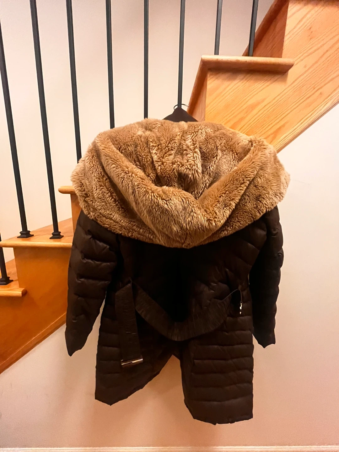 Cozy Tommy Hilfiger down-filled puffer jacket, perfect for chilly days! The jacket features a faux fur-trimmed hood and a stylish belted waist. It's in great condition and ready to keep you warm this winter
