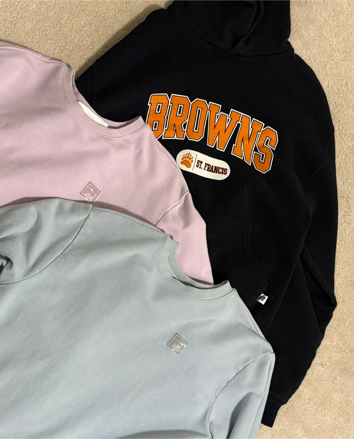 There are 2 Fila crewnecks (light blue and purple) and a black Russell hoodie with "Browns St. Francis" on it.