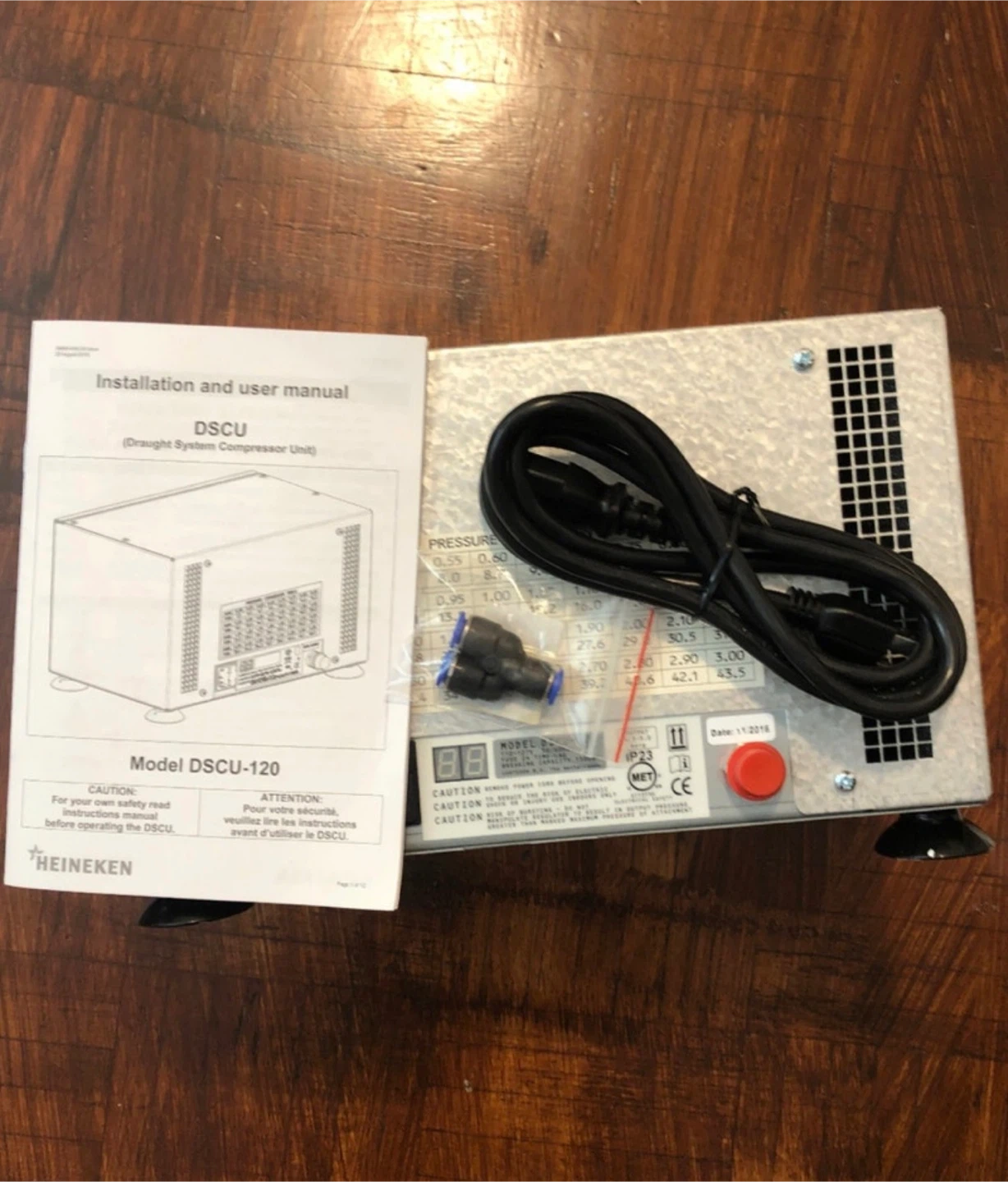 Selling a Heineken DSCU (Draught System Compressor Unit) Model DSCU-120. Includes the installation and user manual, plus some additional components as pictured