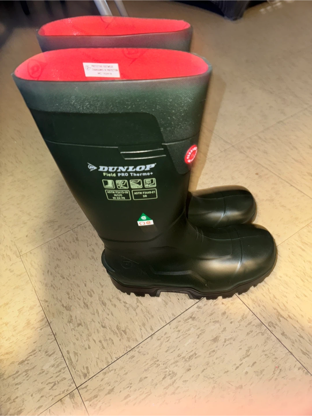 Selling a pair of Dunlop Field PRO Thermo+ work boots. These boots meet ASTM F2413-18 standards for protective footwear and ASTM F3445-21 for slip resistance. Perfect for tough jobs!