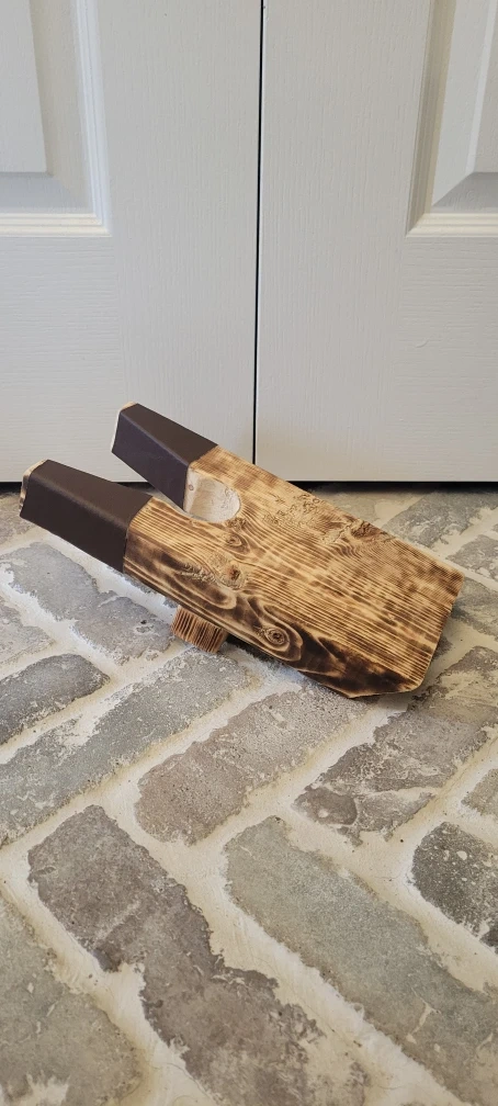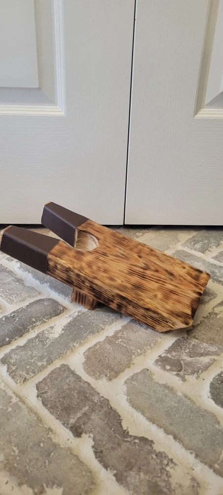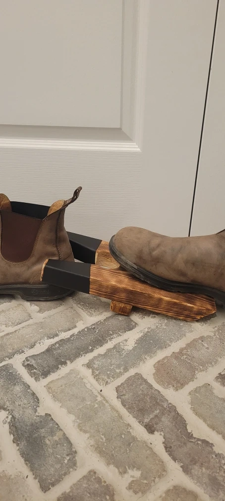 Beautiful handmade wooden boot jacks. Perfect for winter when you don't want to get snow on your feet while taking your boots off. Works on all shoes and boots including blundstones, winter boots, cowboy boots, etc. Comes in different colours and variations. Arms are wrapped with leather to insure your shoes don't get scuffed up. $20 each