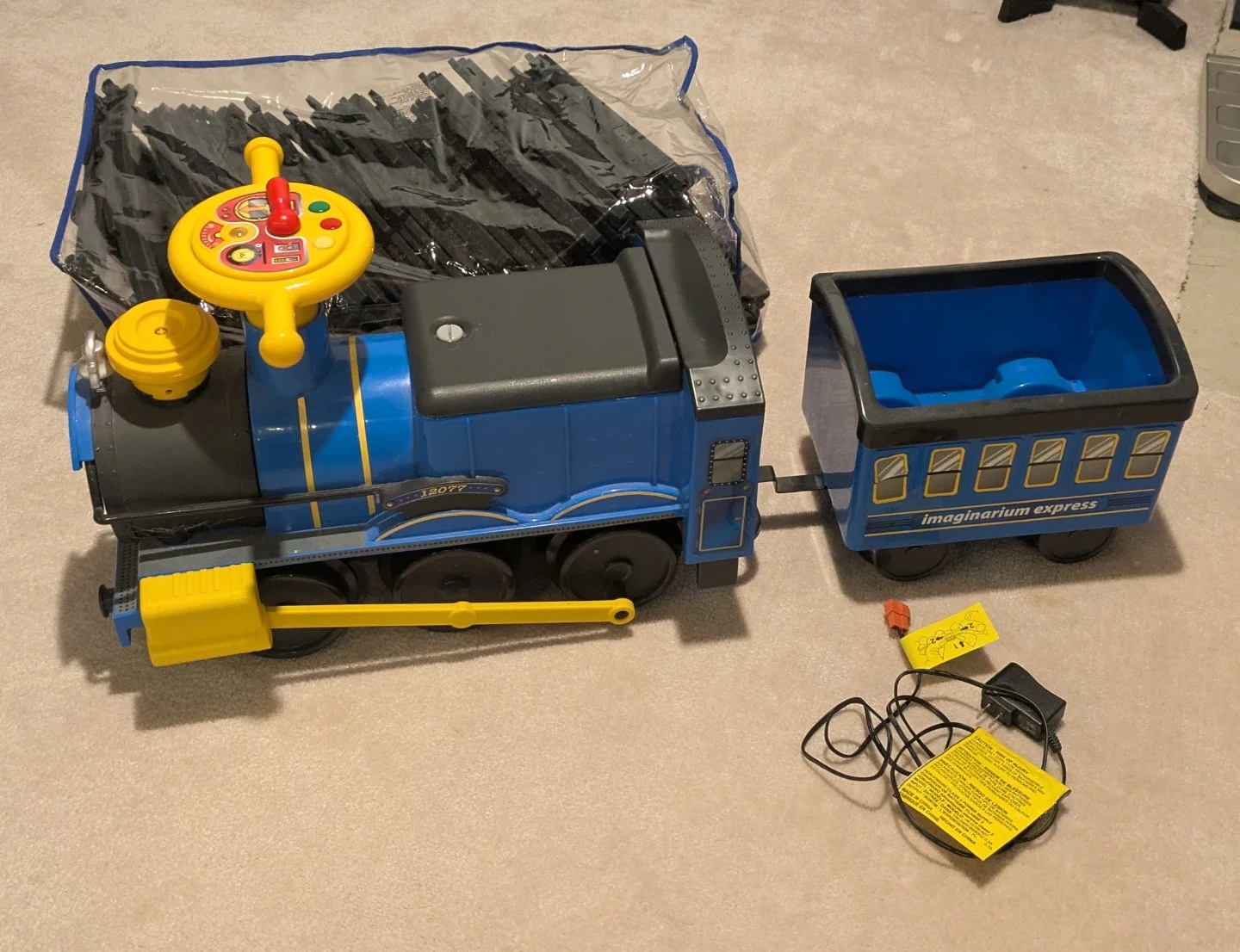 Selling an Imaginarium Express Ride On train set! It comes with the train, a passenger car, and a bunch of tracks to make a fun layout. Also includes the charger!