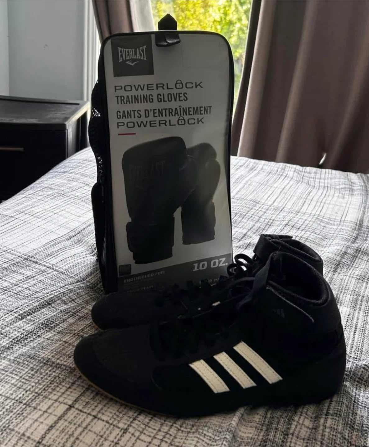 Adidas Men's HVC Wrestling Shoes with Everlast Powerlock2 Pro Leather Boxing Training Gloves with Ho. They were used 1 time and are completely new, adidas size 6 1/2 and 10 oz gloves. And for the two items it's $100. Send a message for more information. Send your best offer too! :)