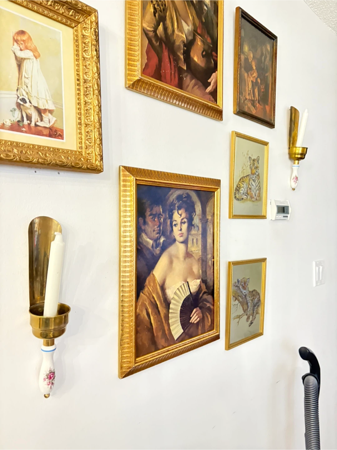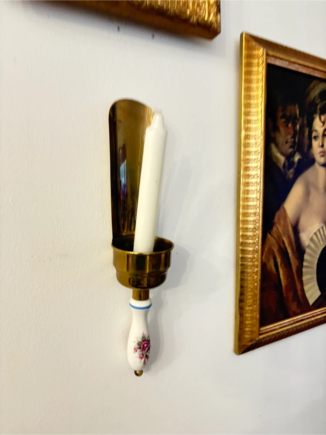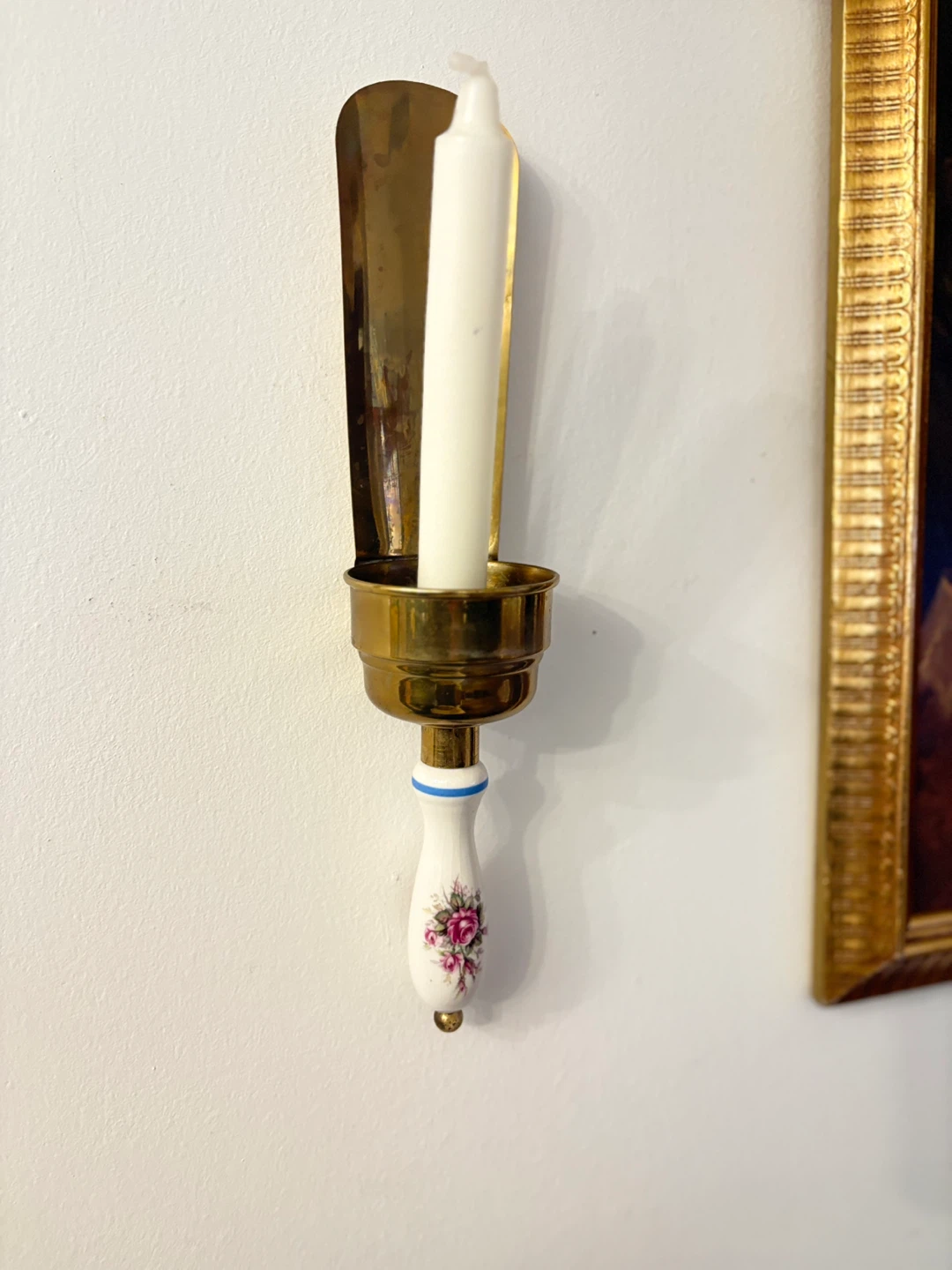 Selling a vintage brass candle holder sconce. It features a brass finish and a handle with a floral design. It's a unique piece that would add a touch of vintage charm to any room