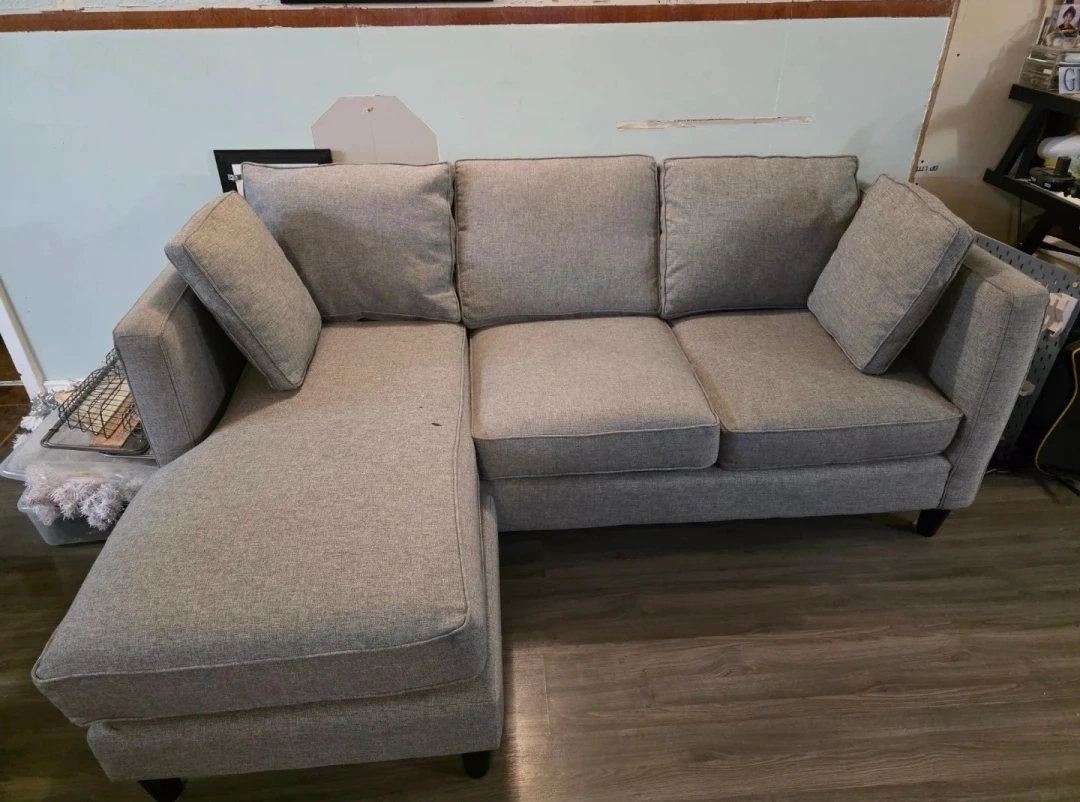 Selling a comfy grey sectional sofa! It features a chaise lounge for extra relaxation and comes with matching throw pillows to complete the look. Perfect for a living room or entertainment space!
