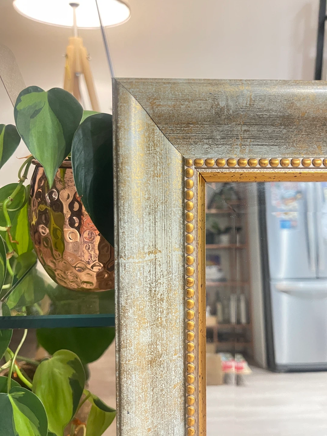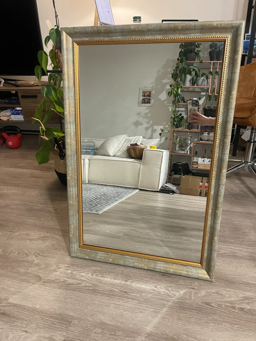 A framed wall mirror in great condition! It has a unique, decorative frame that would add a touch of elegance to any room. Perfect for a bedroom, living room, or hallway.