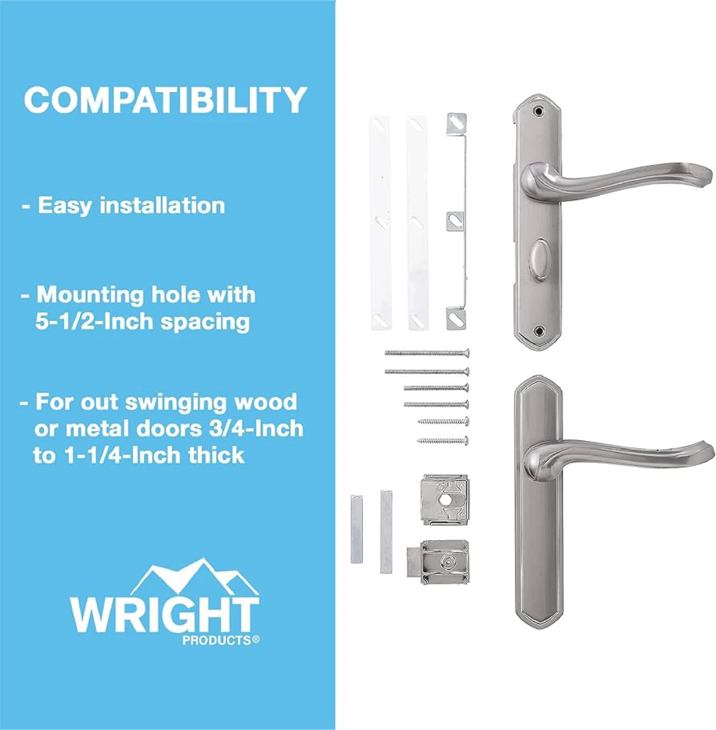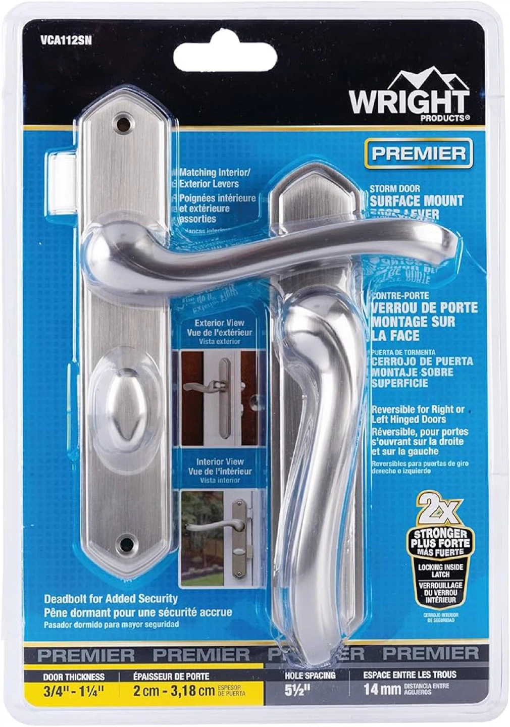 Selling a Wright Products Premier storm door surface mount lever in satin nickel. This lever is reversible for right or left hinged doors. It's designed for door thicknesses of 3/4" - 1 1/4" and has a hole spacing of 5 1/2".