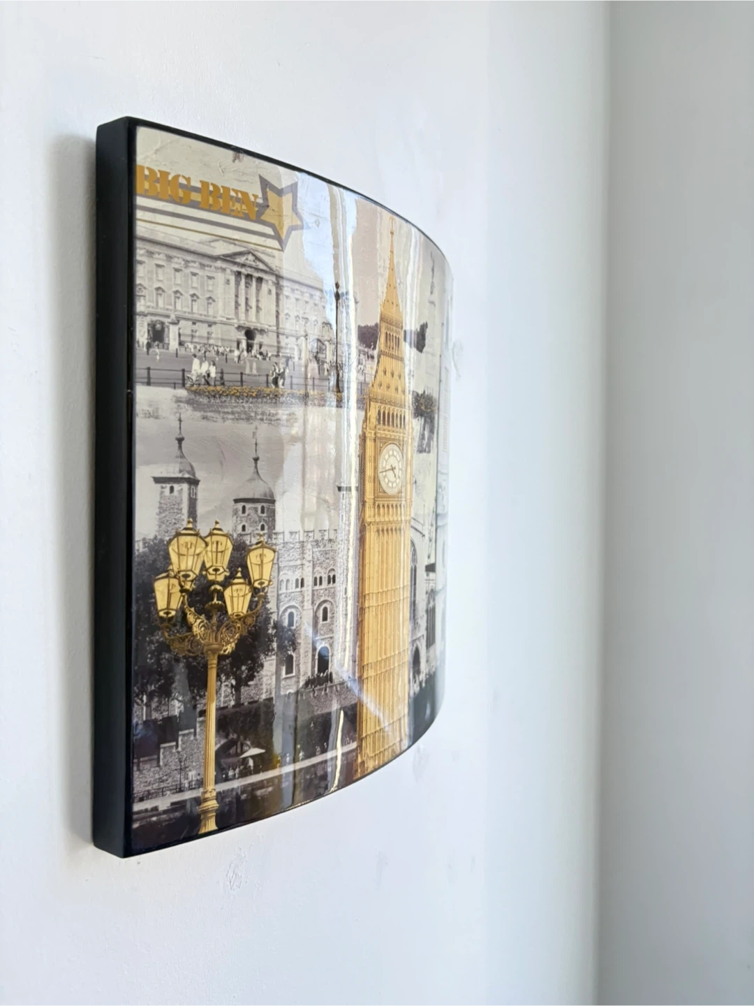 Here's a unique piece of wall art featuring London's iconic Big Ben! It measures approximately 11 inches wide and 13 inches tall, making it a great size for any room. It's in great condition