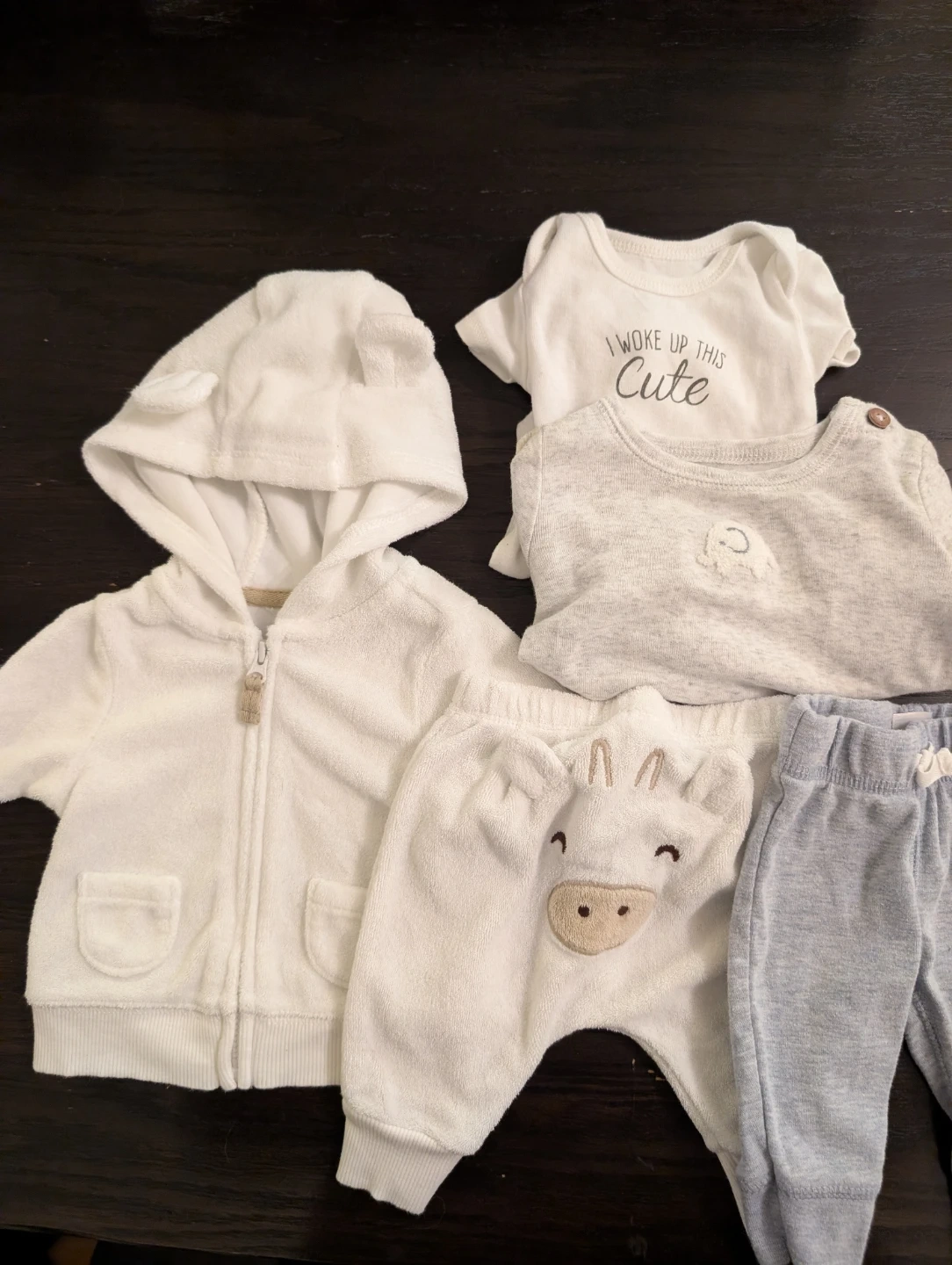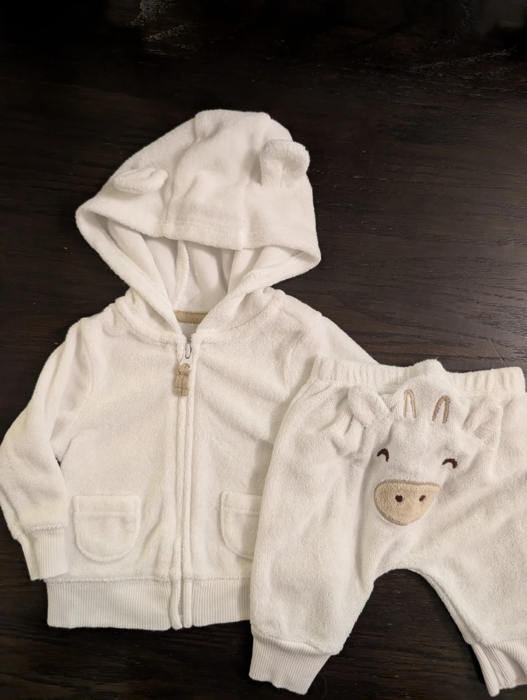 Selling a bundle of gently used baby clothes! Includes a onesie, pants, and a towel hooded jacket/pants. All items are in good condition and perfect for your little one