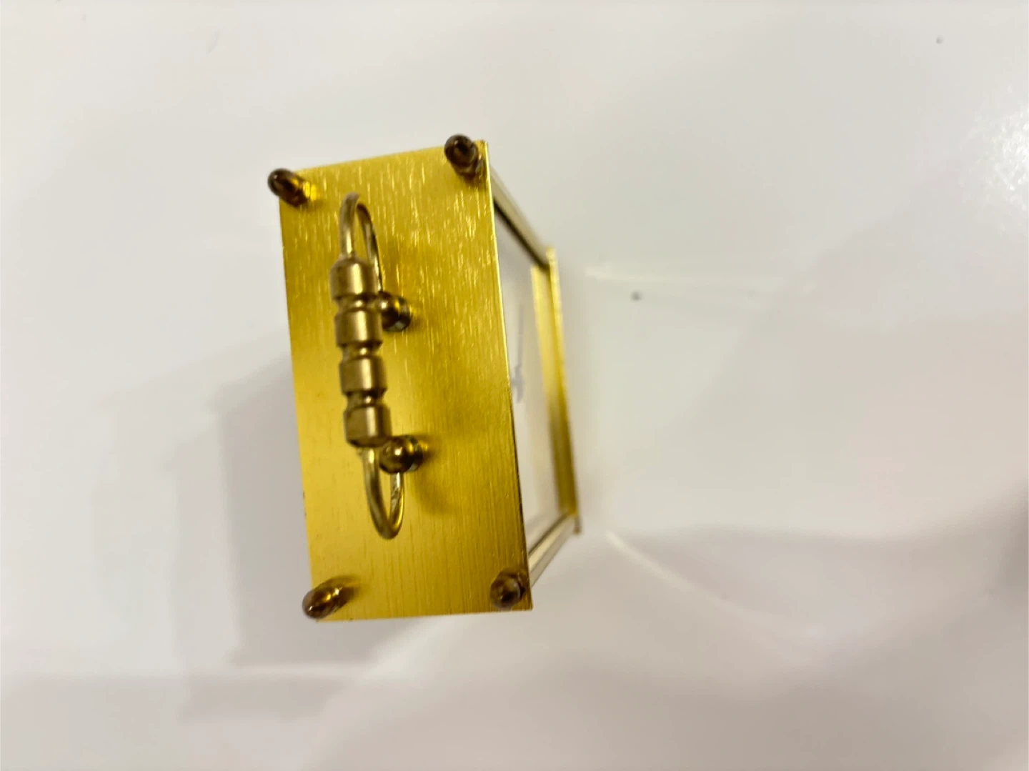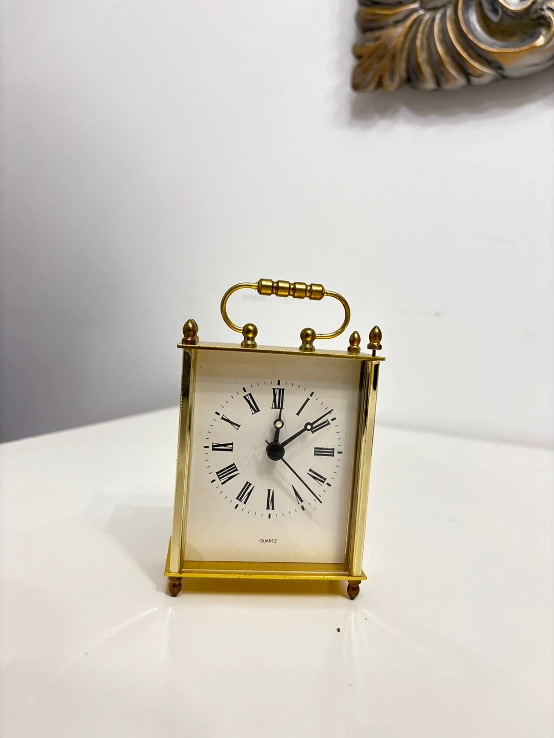Selling a lovely vintage-style carriage clock. It has a classic design with a gold finish and a quartz movement. It's in great condition and would look beautiful on a mantelpiece or desk. The back has a compartment that opens up.