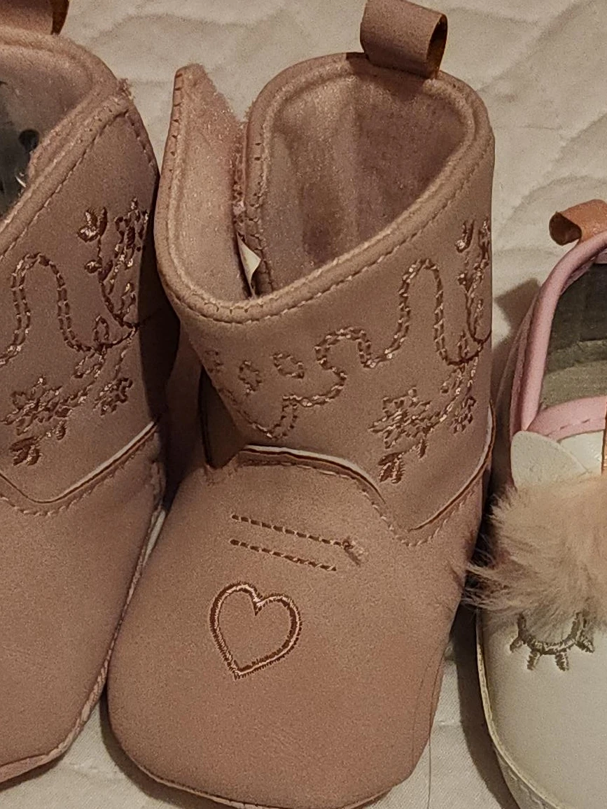 These baby booties are so cute! They are a light pink color and have a heart stitched on the front. They have a cute cowboy boot design with floral accents