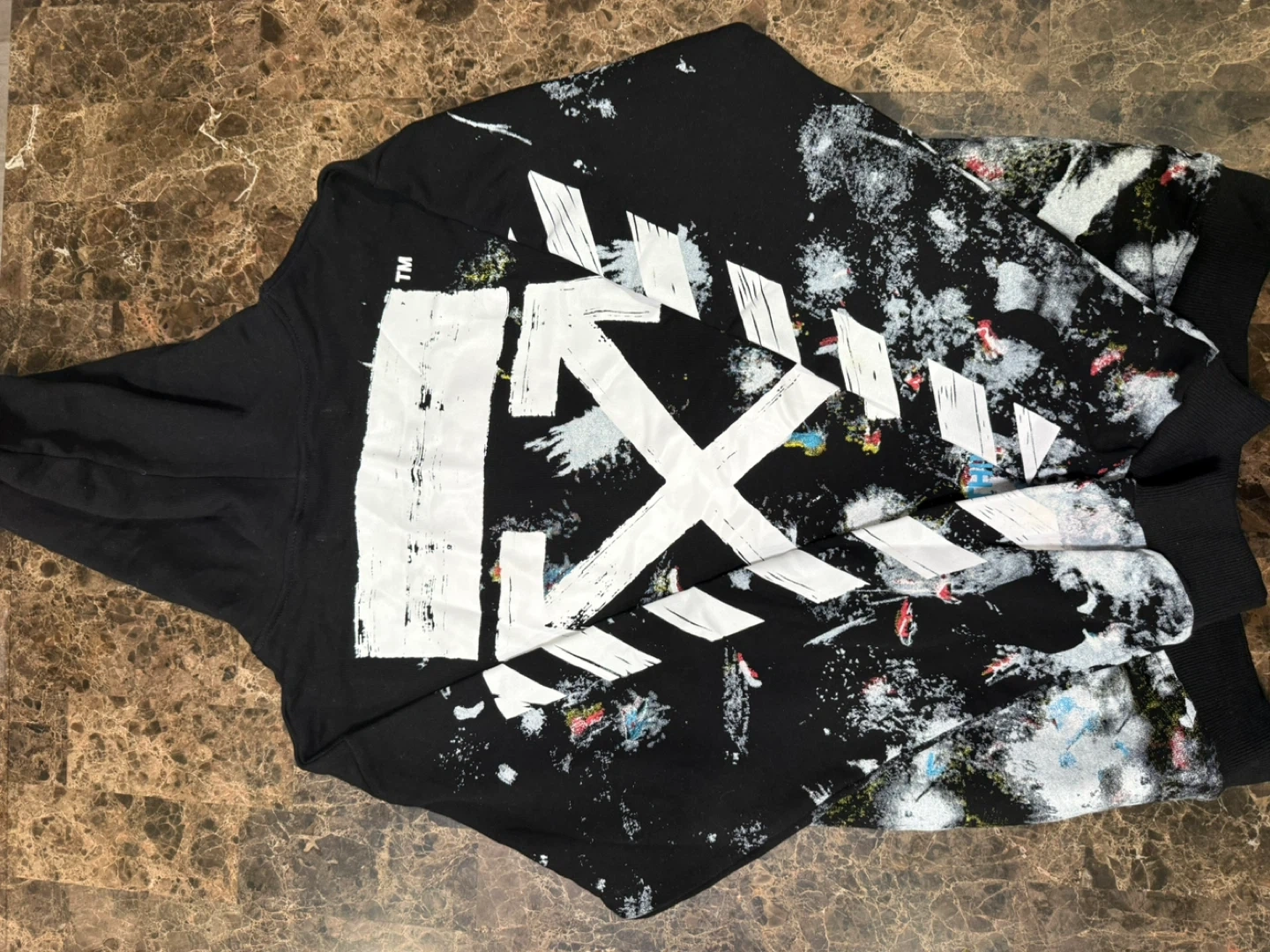 Selling a cool OFF-WHITE hoodie in black. It features a unique design with colourful accents and the iconic arrow logo on the back. Definitely a statement piece!