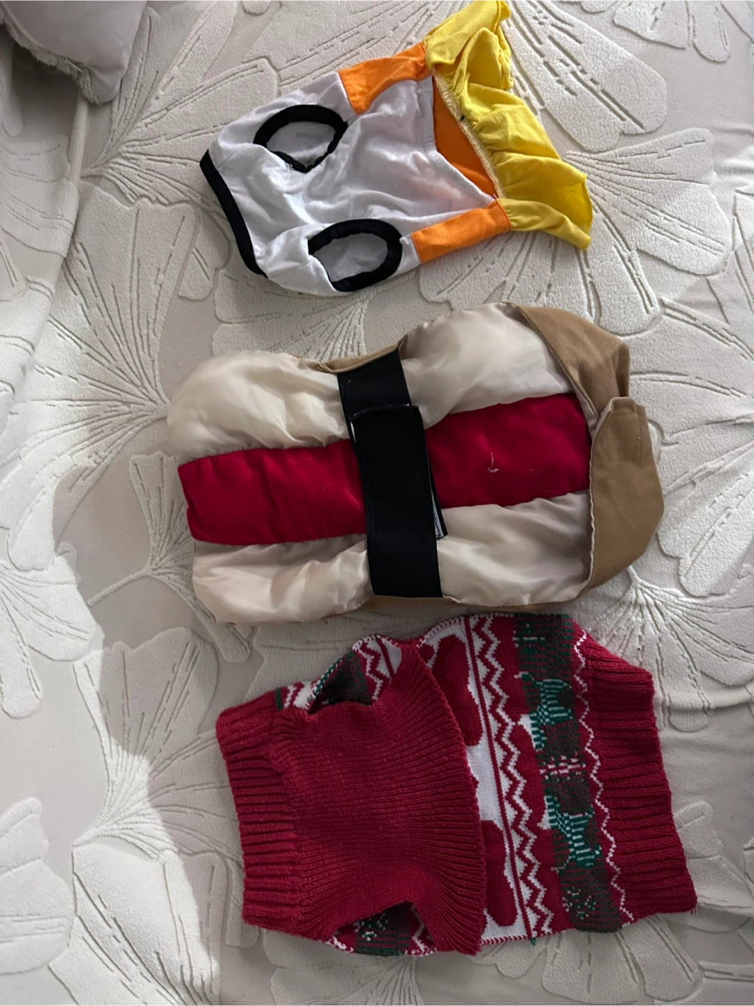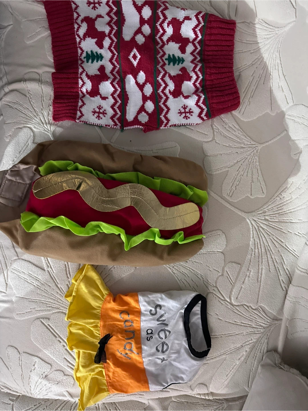 Giving out a bundle of adorable dog costumes and a cozy sweater! The bundle includes a hot dog costume, a candy corn dress, and a festive Christmas sweater. Perfect for dressing up your furry friend for any occasion! they are small - would say it’s gonna fit a dog of around 12-20lb The red sweater is gone. Others are still available