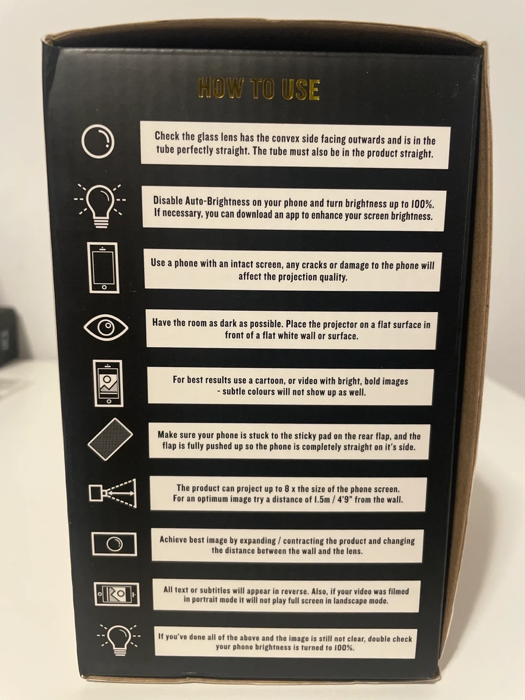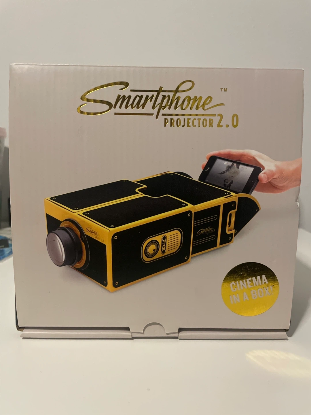 Donating a Smartphone Projector 2.0, it's like having a cinema in a box! The product can project up to 8 times the size of your phone screen. For an optimum image try a distance of 1.5m / 4'9" from the wall. Achieve best image by expanding / contracting the product and changing the distance between the wall and the lens. It comes with instructions on how to use it.