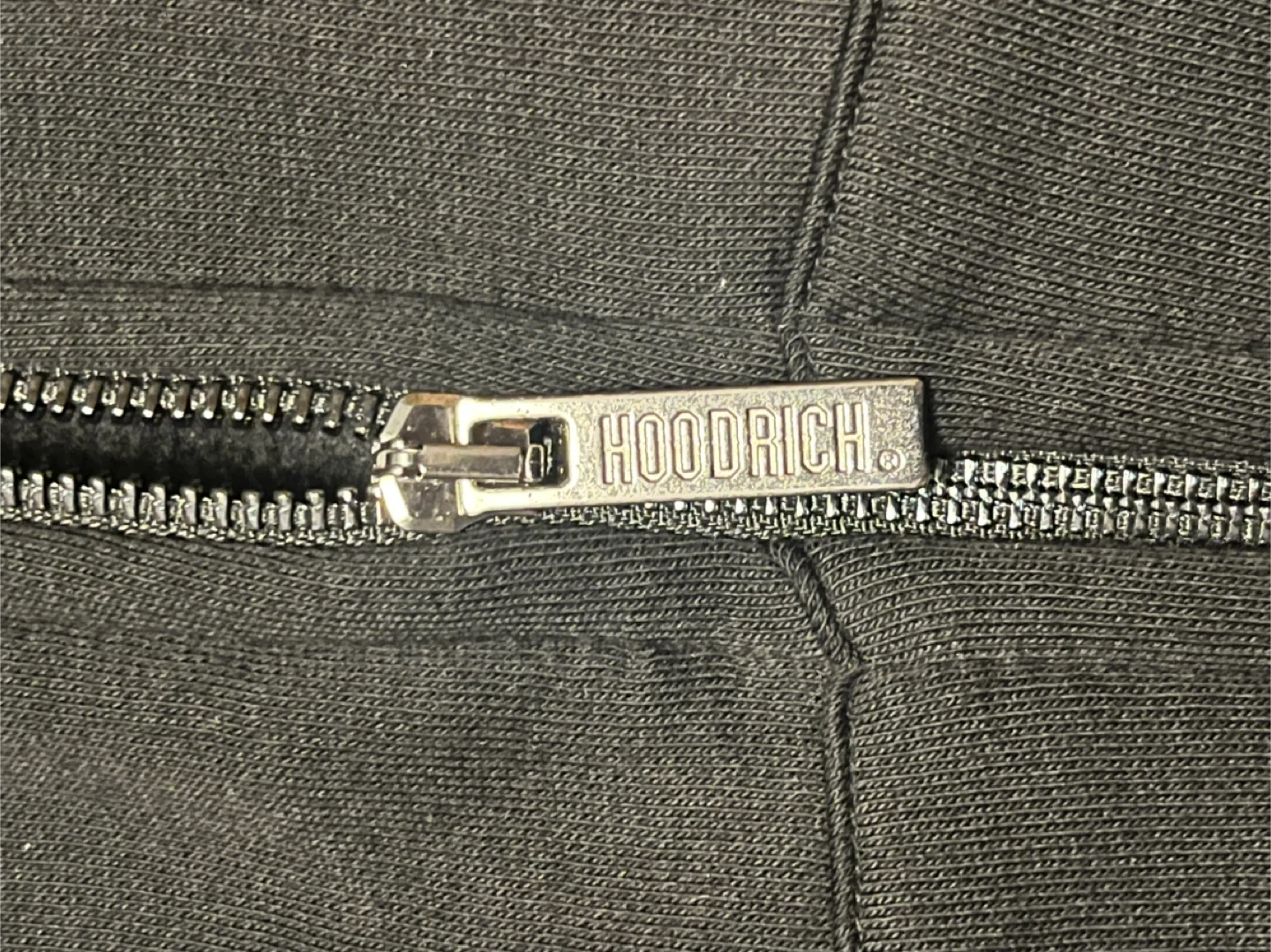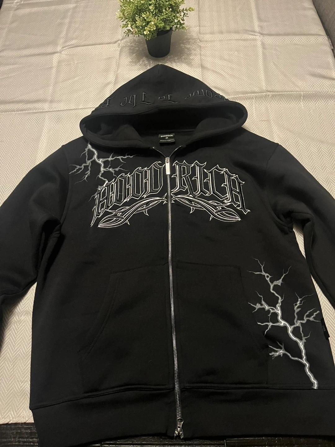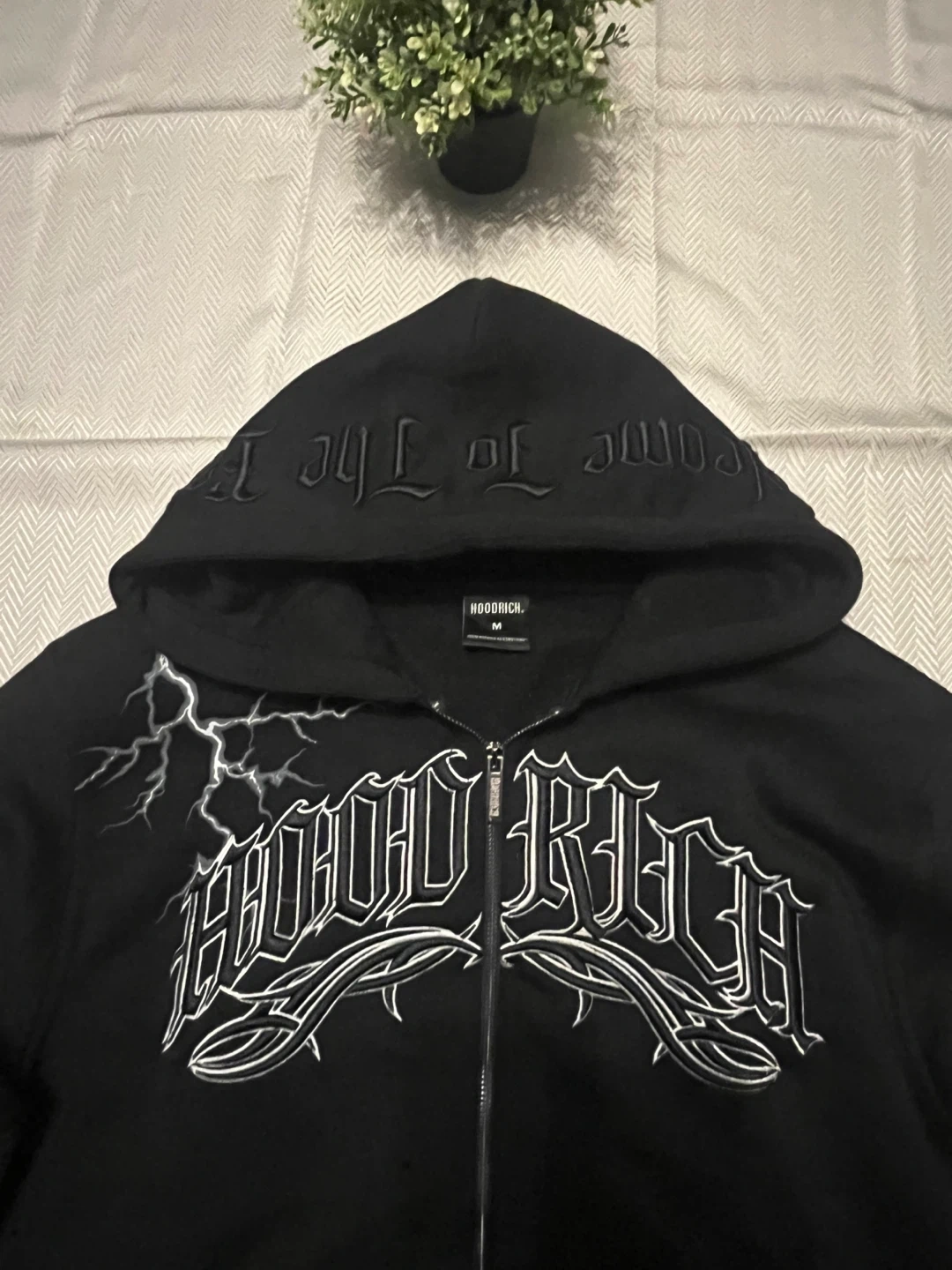 Selling a Hoodrich full zip hoodie in black, size medium! The hoodie features a cool design with lightning bolts and the Hoodrich logo.