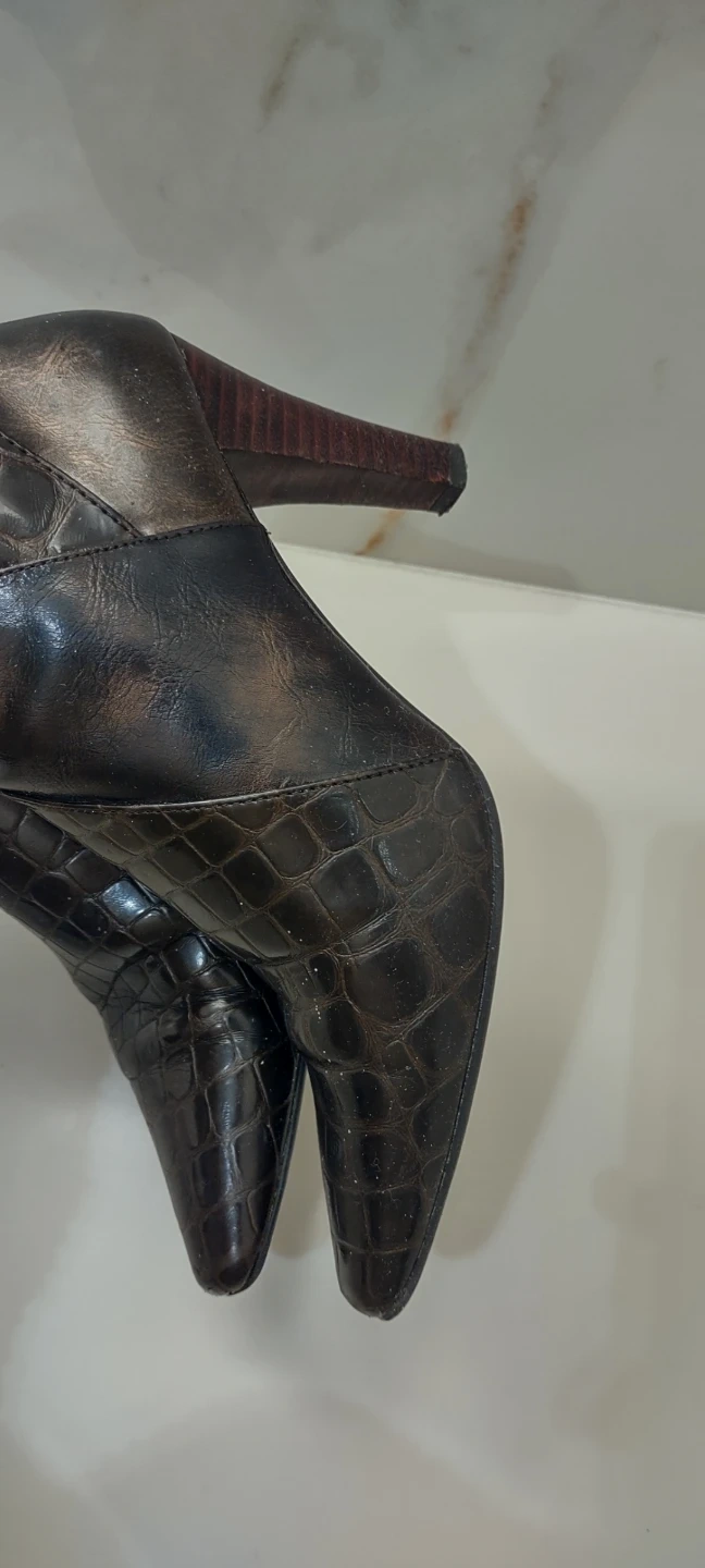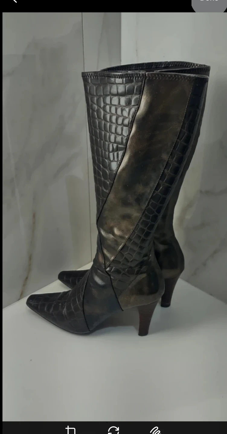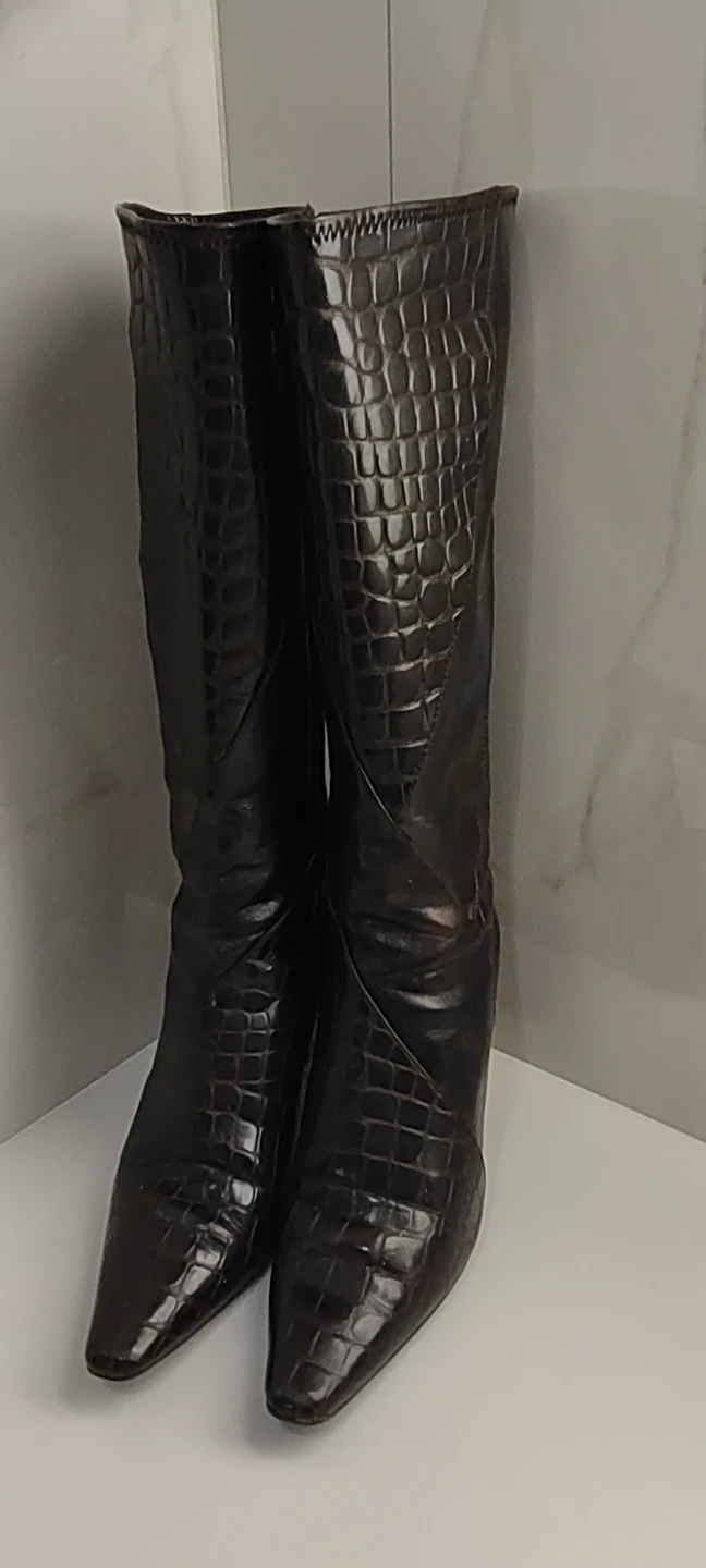 These are a pair of brown knee-high boots in a size 8. They have a unique crocodile-like texture. Perfect for adding a bit of style to your wardrobe!