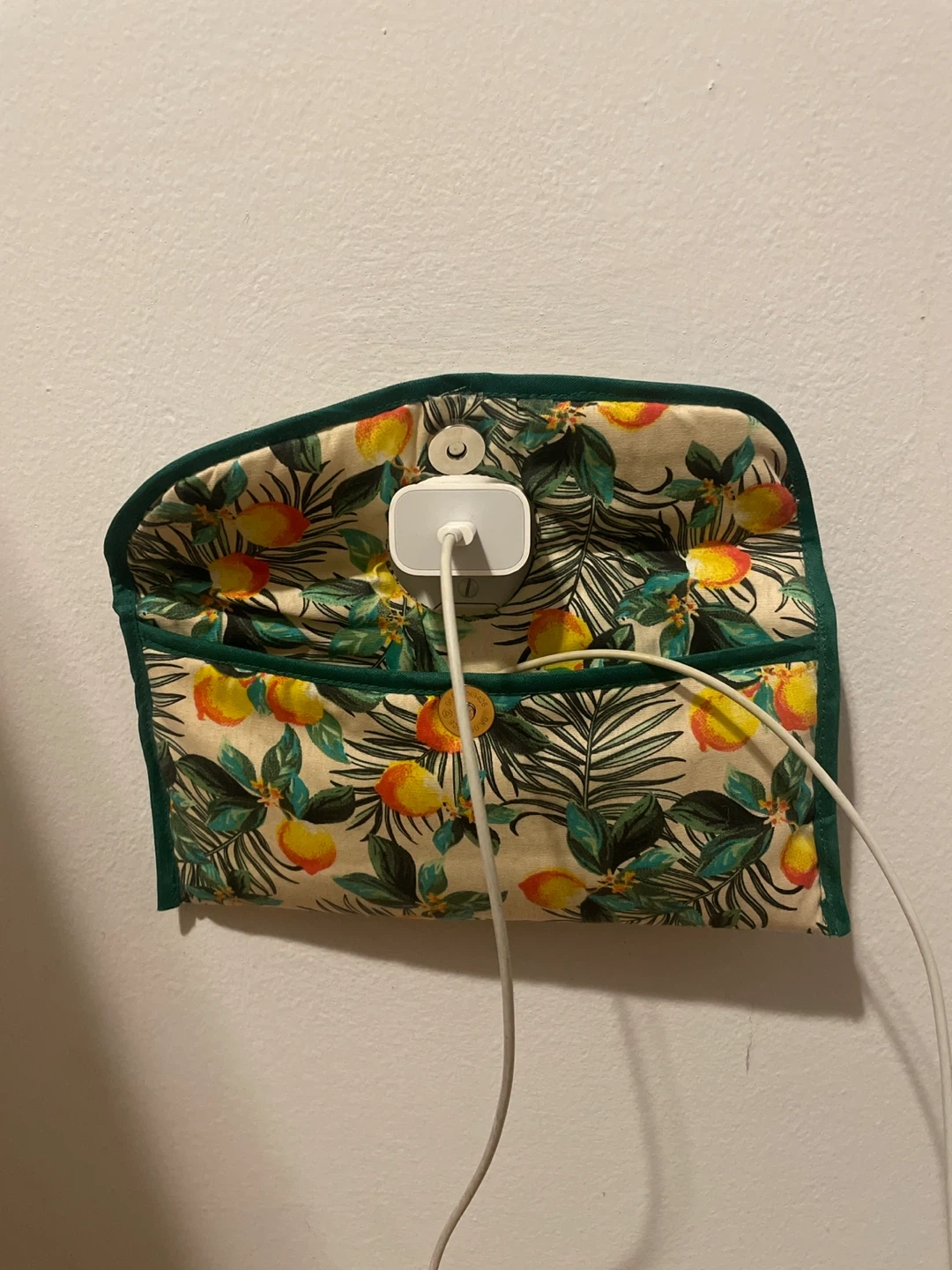 Check out this handmade electronics organizer! It's perfect for keeping your chargers and cables tidy, your phone off the floor, while adding a touch of style to your space. The floral print is super cute and the construction is really well done, making it a practical and pretty addition to your home or travel gear