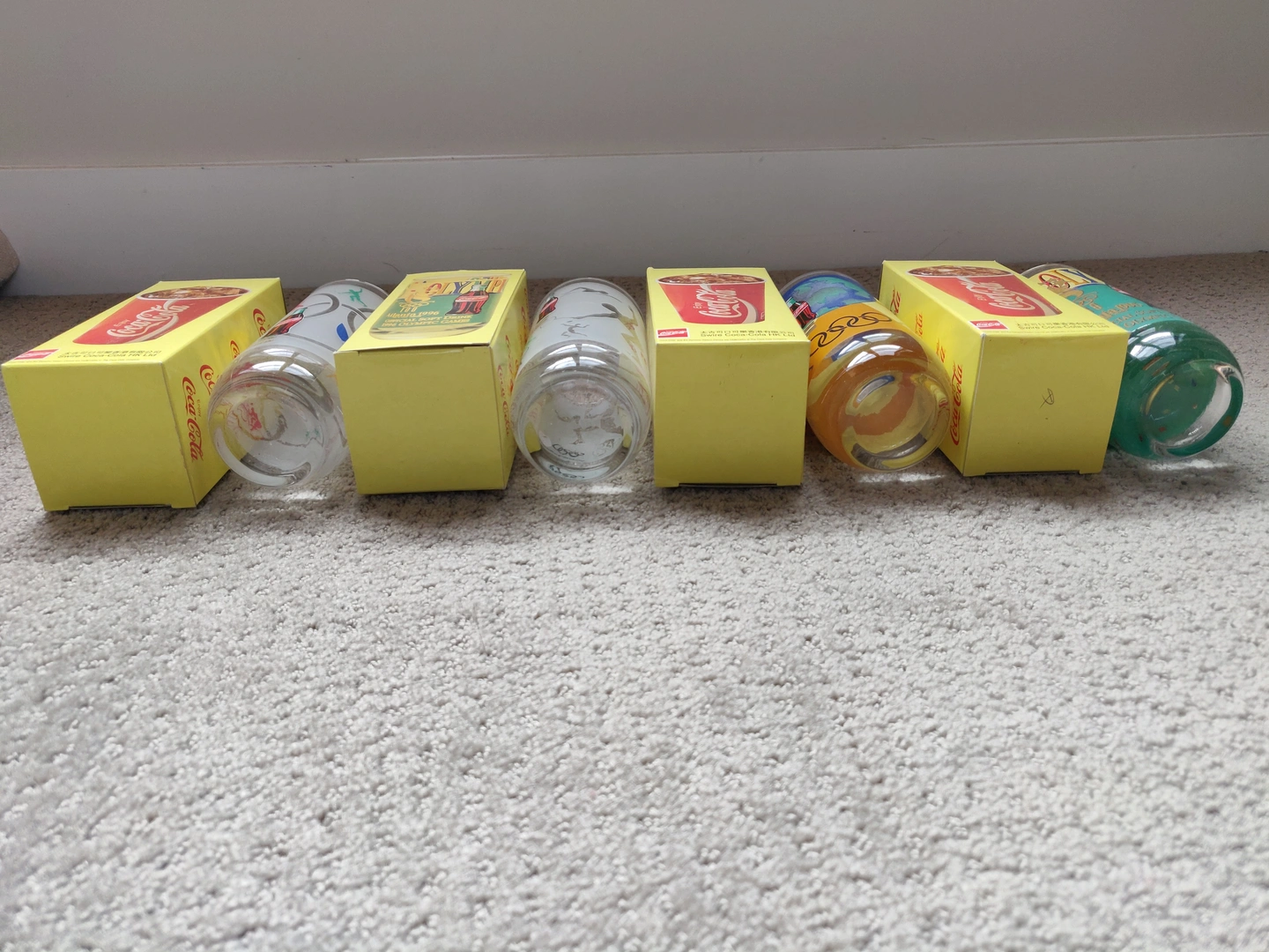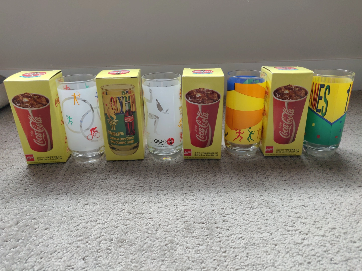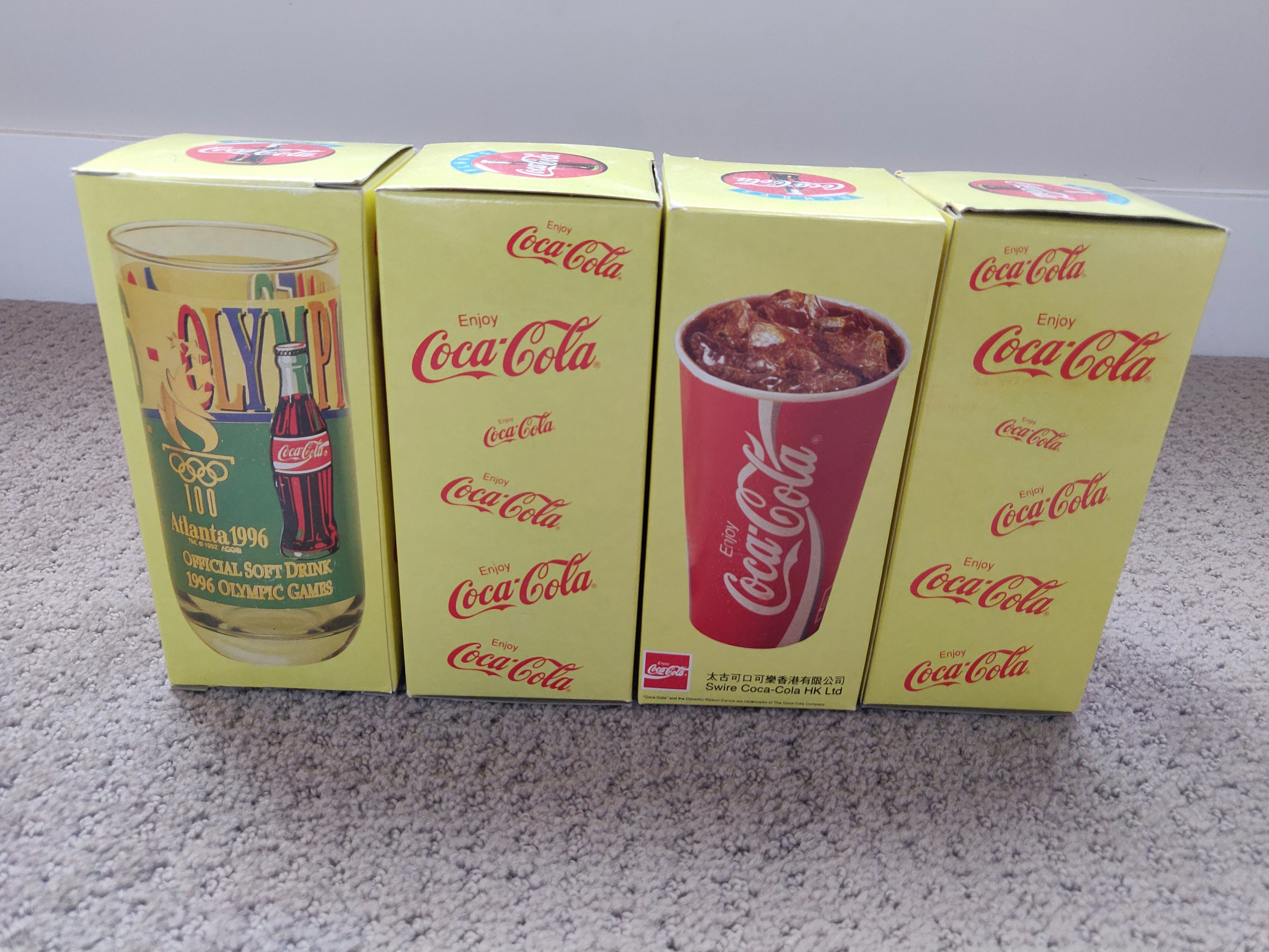 174NOTE: The glasses themselves are in new, unused condition with no chips, cracks, or scratches. The boxes are also in very good condition, with some minor wear consistent with storage. Please note the following imperfections, visible in the attached photos: * A few of the boxes have minor pen markings on the top. * One box has a small bend in a corner. I am selling a set of 4 Rare Coca-Cola / Coke Mugs Collector Glasses - Atlanta 1996 Summer Olympics Game in new condition. No damage to any of the graphics. Celebrate the spirit of the Olympic Games with this rare and highly collectible set of four Coca-Cola glasses from the Atlanta 1996 Summer Olympics. This set is in new condition, with each glass featuring unique and vibrant graphics inspired by the games. These are more than just glasses; they are a piece of Olympic and Coca-Cola history, perfect for any collector or sports enthusiast. Features of this Exclusive Set: * Four Unique Designs: The collection includes four distinct glasses, each with a different graphic celebrating the 1996 Summer Olympics. One glass features the iconic Olympic rings and "Atlanta 1996" text, another displays various sporting silhouettes, a third showcases a dynamic, colorful abstract design, and the last highlights the classic Coca-Cola branding within an Olympic theme. * Vibrant and Intact Graphics: The graphics on all four glasses are in new condition, with no damage, fading, or peeling, preserving their vibrant colors and detail. * Original Packaging: Each glass comes in its original box. The boxes themselves are a part of the collectible value, featuring "Coca-Cola" and "Always" logos, along with images of the glasses and the official 1996 Olympics branding. Dimensions: * Height: 5-3/4" * Diameter: 2-1/2" This is a fantastic opportunity to own a piece of memorabilia from one of the most memorable Olympic Games. Don't miss your chance to add this rare and well-preserved set to your collection! Comes from a pet and smoke-free environment. Pickup in Mount Pleasant (NW Calgary)