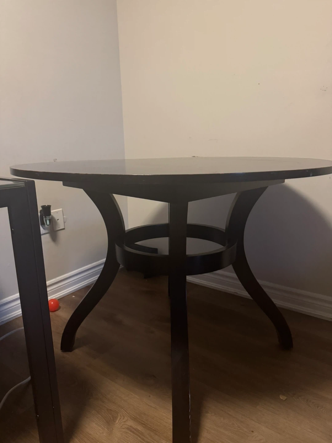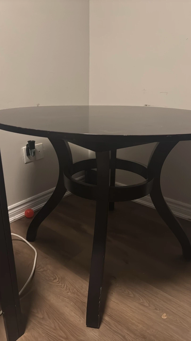 Selling a dark brown round dining table. It's in good condition and would be great for a smaller space. The table has a sturdy base and a smooth, easy-to-clean surface. It's perfect for cozy dinners or casual gatherings