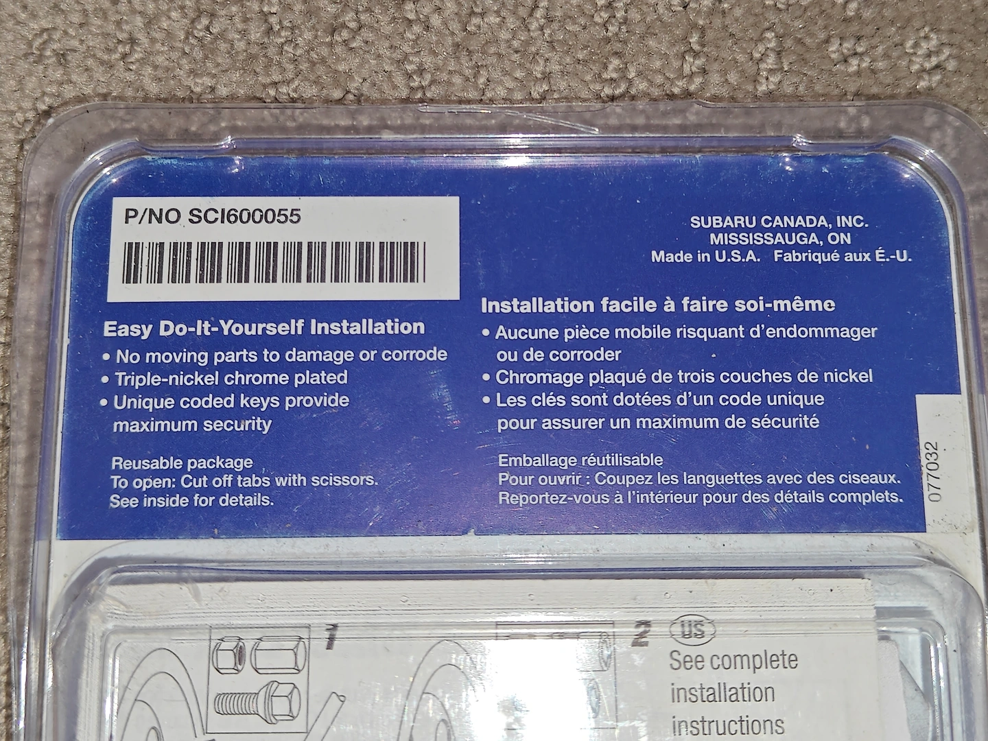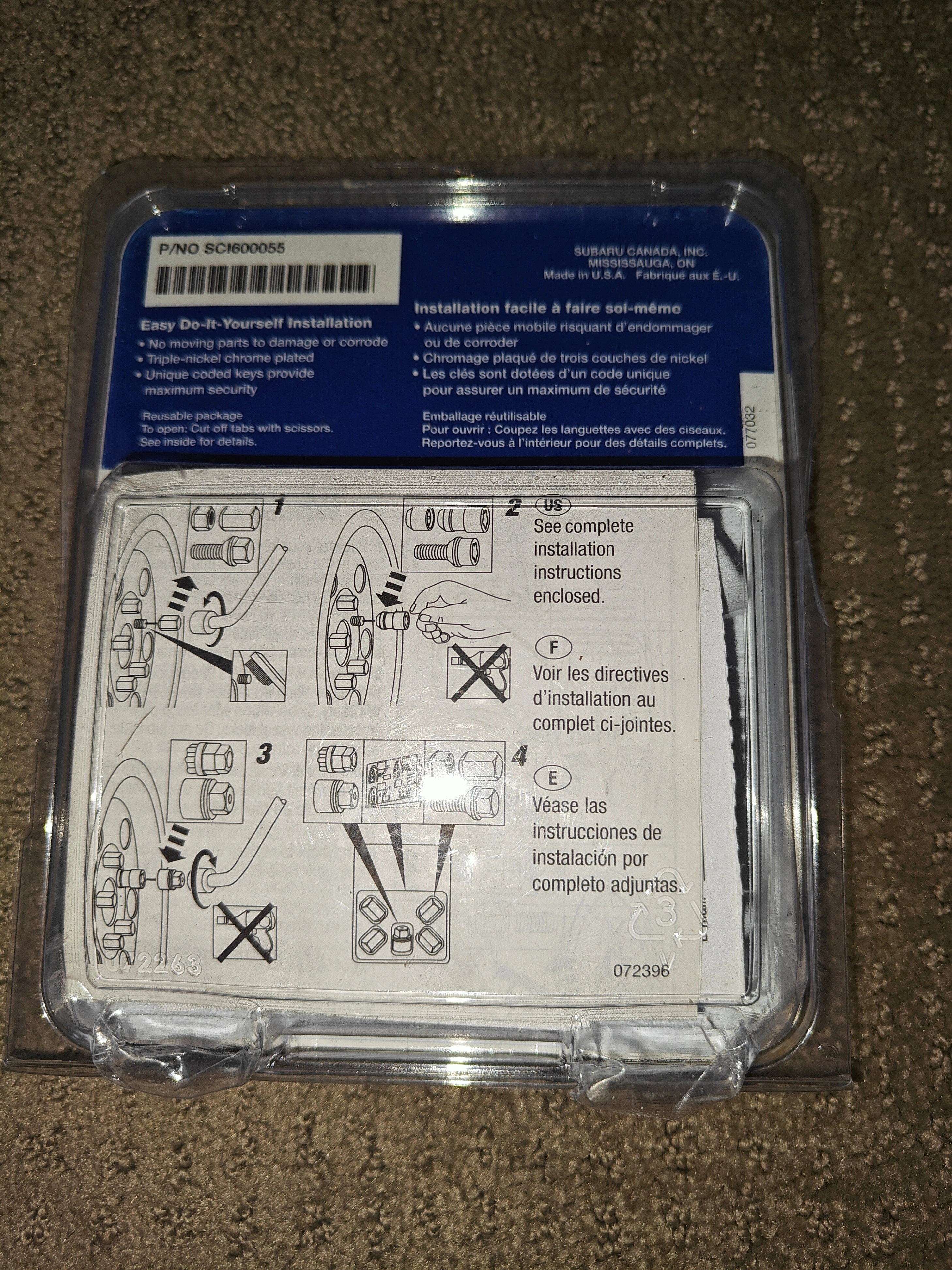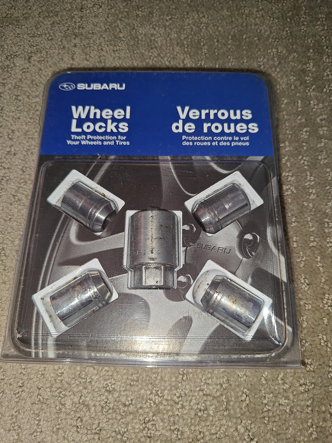 174NOTE 1: Price is firm NOTE 2: These wheel locks were previously installed on a 2018 Subaru Crosstrek I am selling Subaru Wheel Lock Lug Nuts Set - Tires Theft Protection in used, working condition. No issues. Theft Protection for Your Wheels and Tires. Original OEM Genuine Subaru Parts. Also includes Wheel Lock Installation Instructions. Part Number: SCI600055 Features: * Easy Do-It-Yourself Installation * No moving parts to damage or corrode * Triple-nickel chrome plated * Unique coded keys provide maximum security Comes from a pet and smoke-free environment. Pickup in Mount Pleasant (NW Calgary)