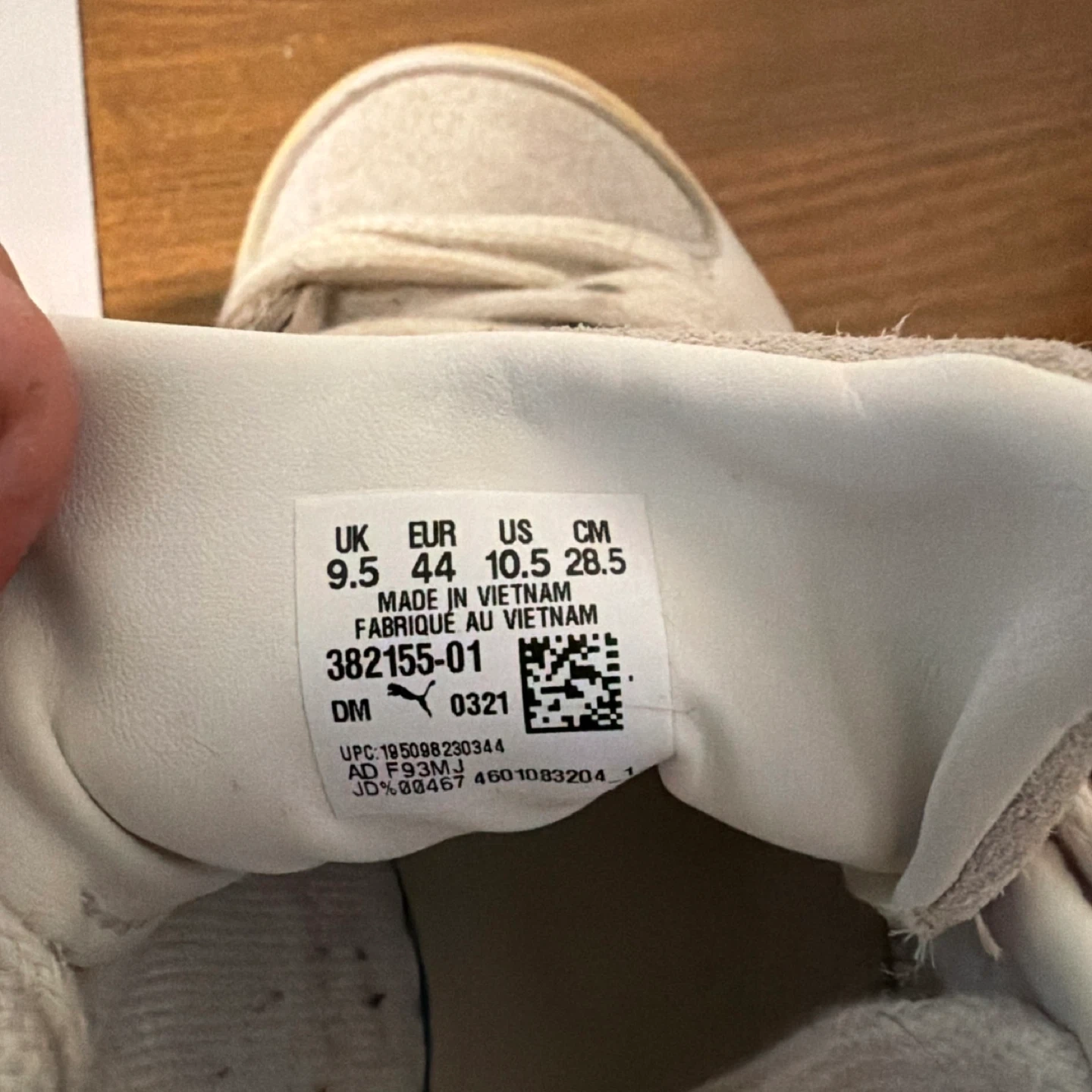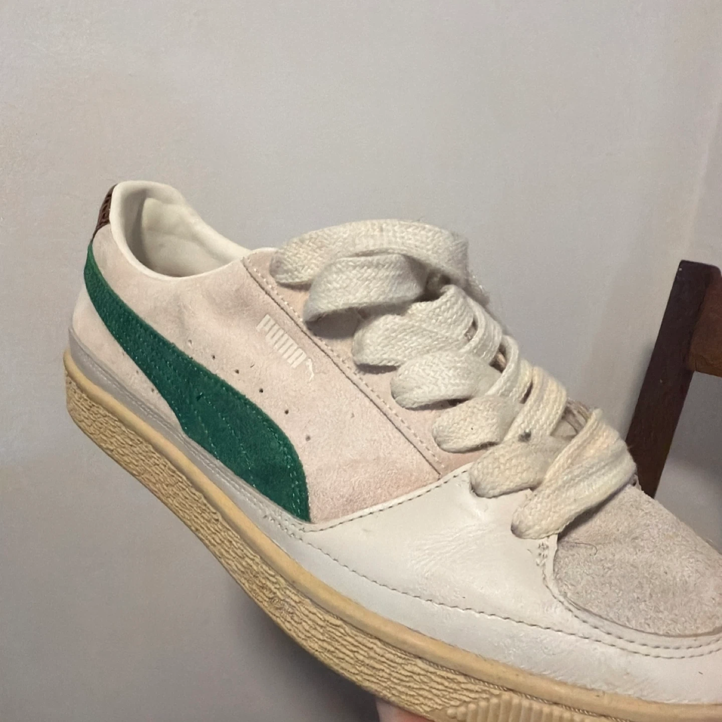 Selling a pair of Puma Suede Vintage MIJ Rhuji sneakers. These are a US size 10.5. They have a classic suede and leather design with a green stripe. Please see photos for condition