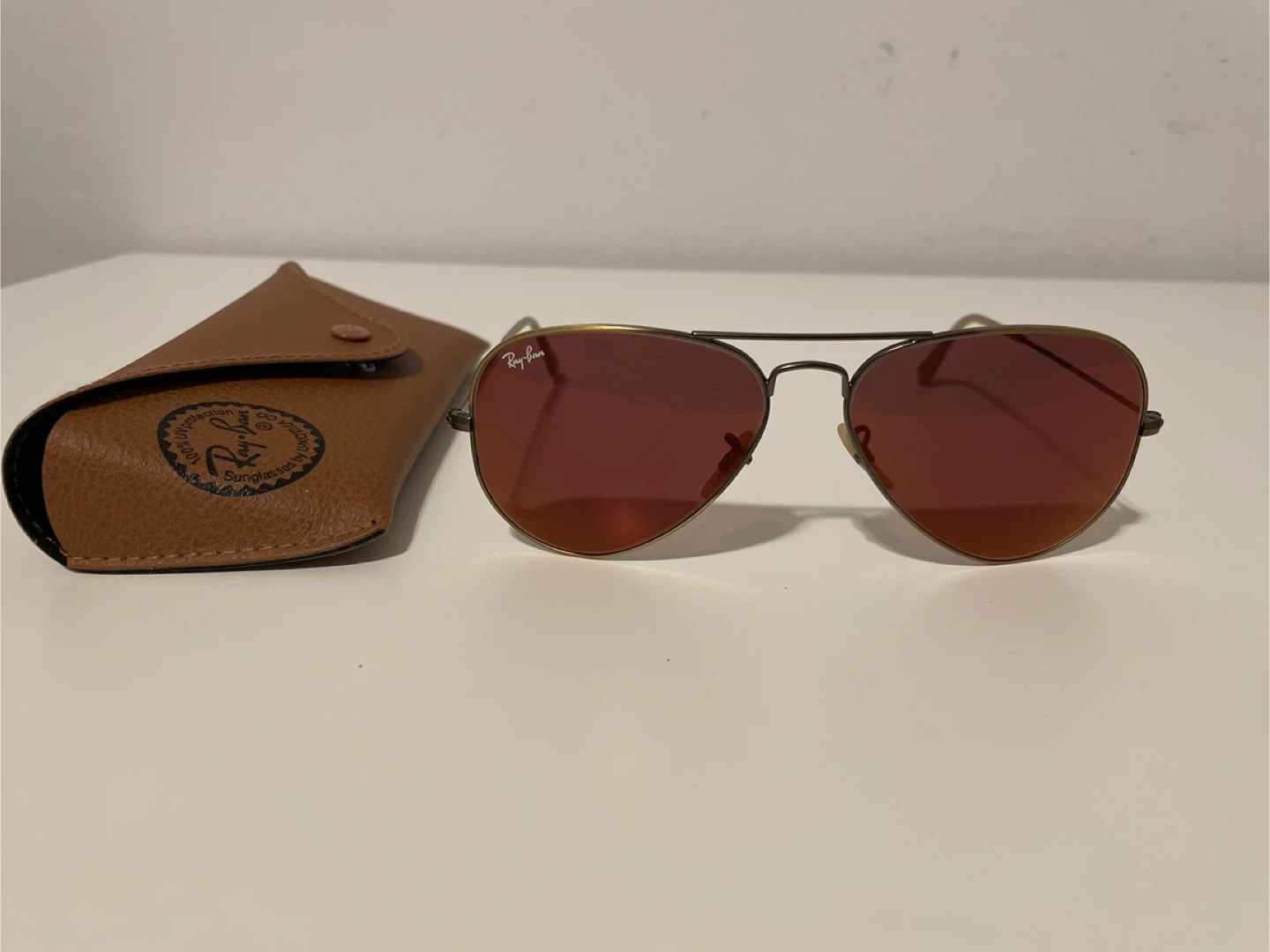 Selling a pair of Ray-Ban aviator sunglasses, copper/maroon lenses. They come with the original case. They are in great condition and ready for a new home!
