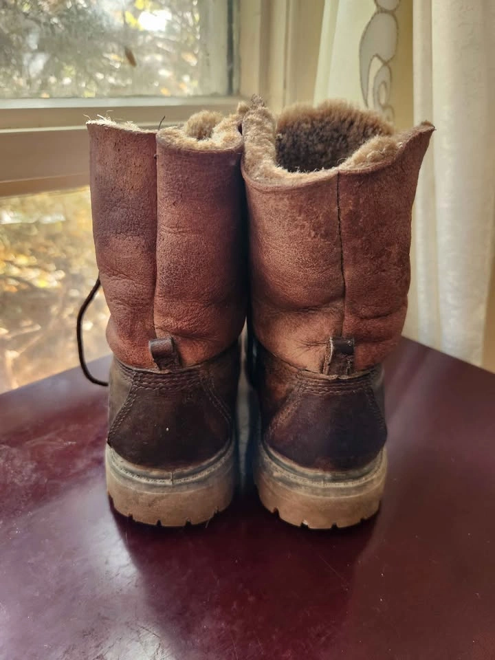 • Beautiful brown sturdy leather lower half and soft brushed suede upper with faux fur shearling lined