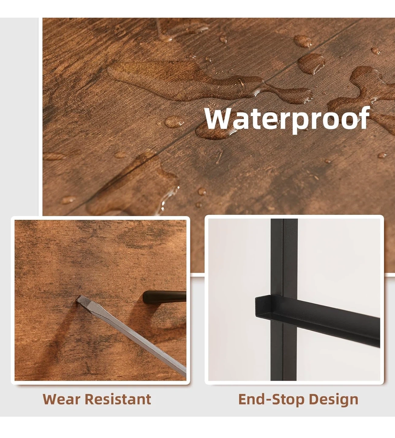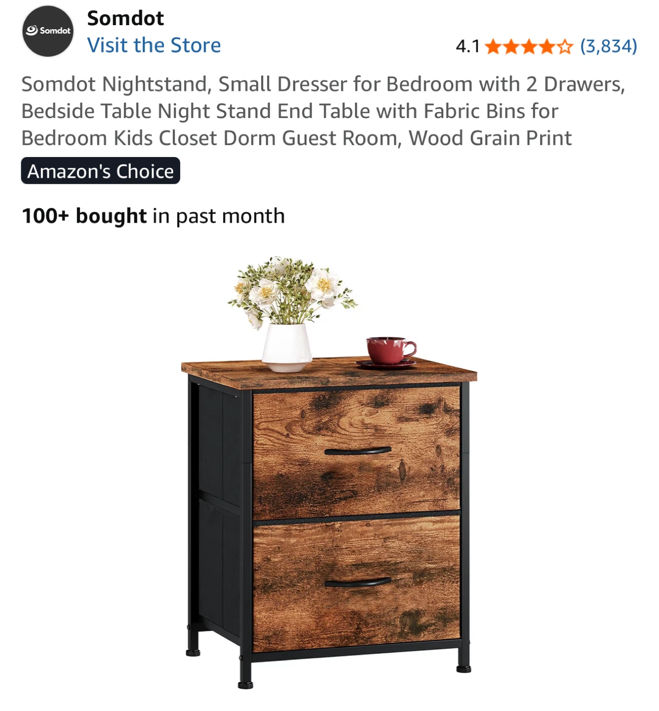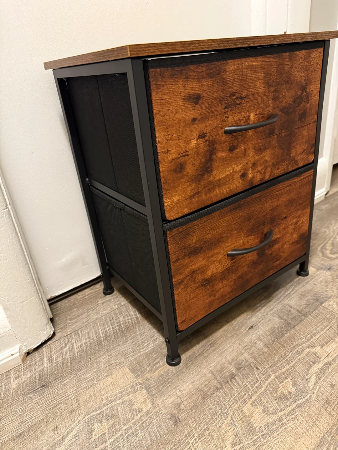 This Somdot nightstand is perfect as a bedside table or small dresser! It features two drawers with a wood grain print and black metal frame.