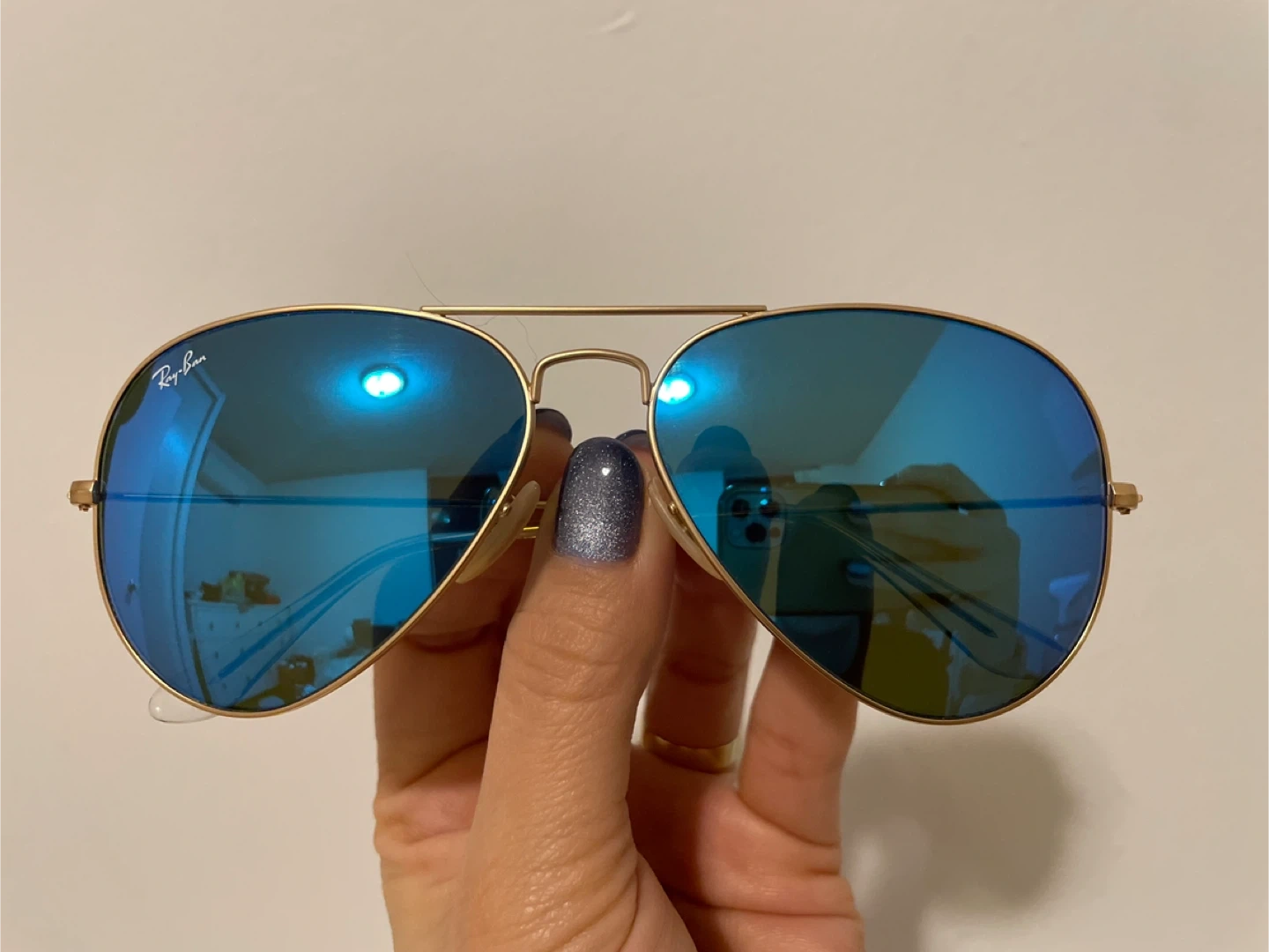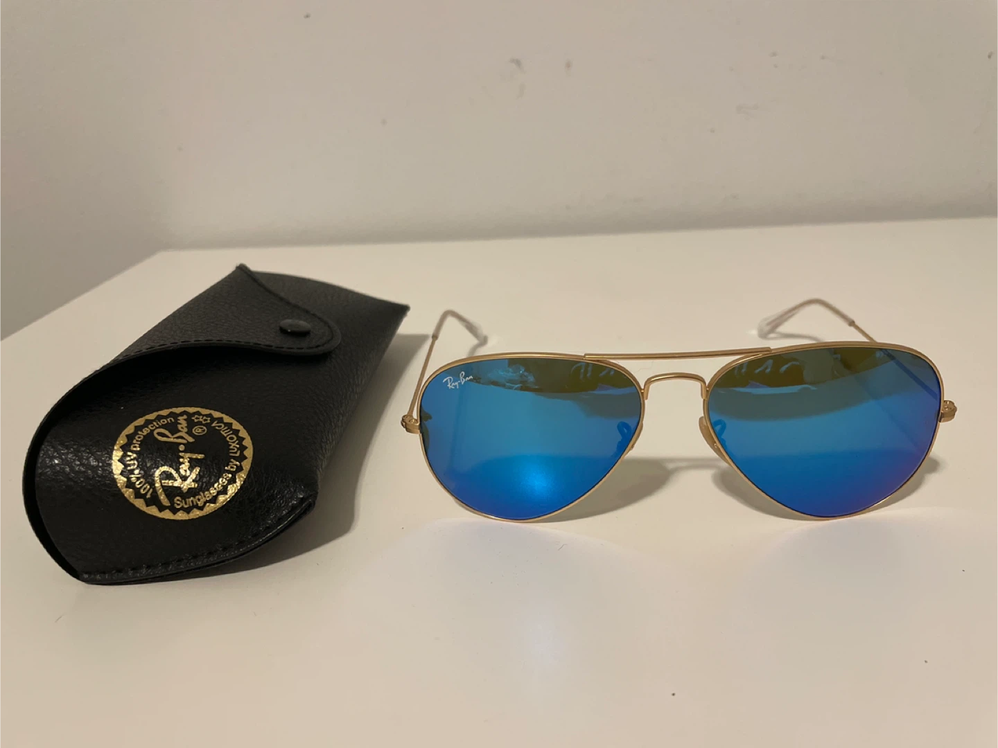 Selling a pair of Ray-Ban Aviator sunglasses! They have a gold frame and blue lenses. Comes with the original Ray-Ban case to keep them protected.