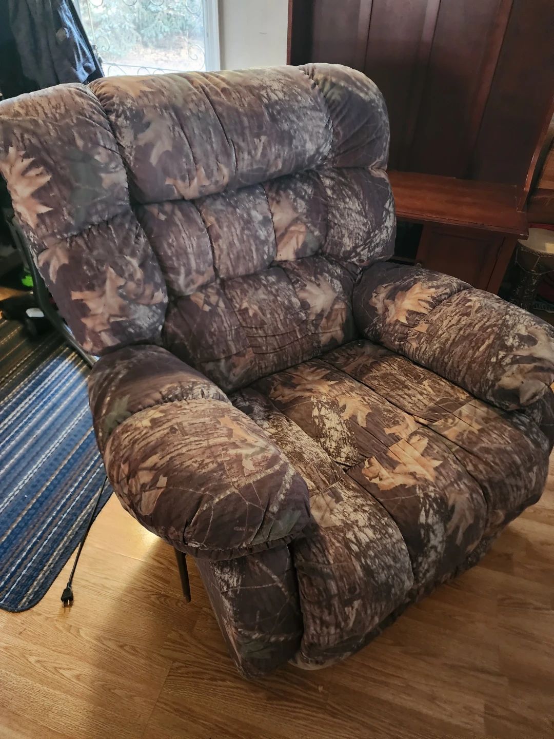 Selling a comfy recliner armchair with a unique camouflage pattern. It's perfect for relaxing after a long day. The chair is in good condition and ready for a new home