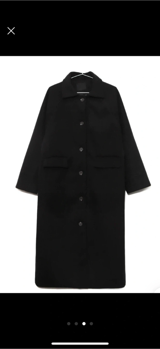 A stylish black long coat, perfect for the colder weather! It's a classic design that can be dressed up or down. The coat appears to be made from a wool blend material. It's in great condition and ready for a new home!