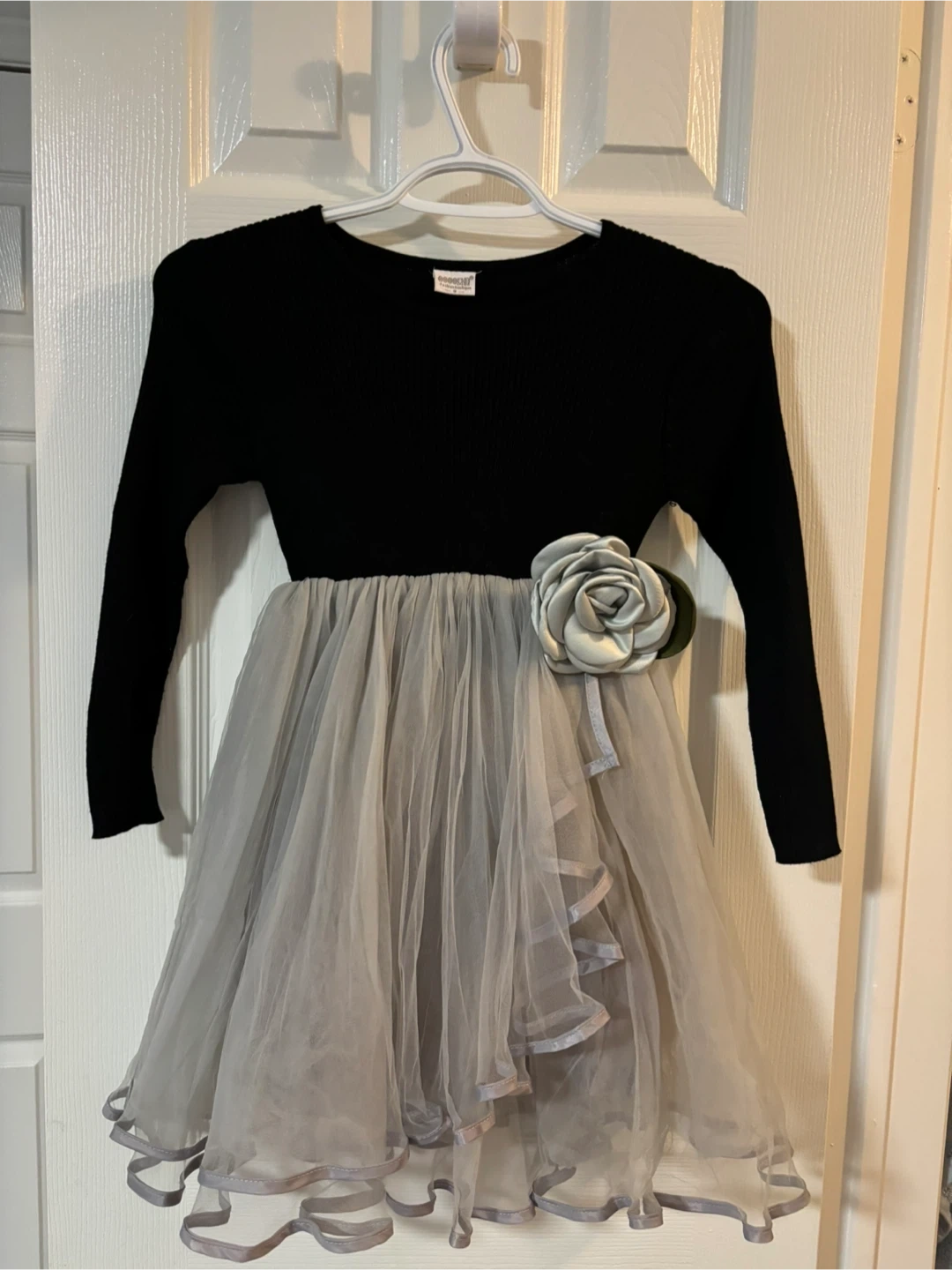 A cute dress for girls in size 5! The top is black with long sleeves, and the skirt is a lovely grey tulle. There's also a decorative flower on the front, making it perfect for parties or special occasions