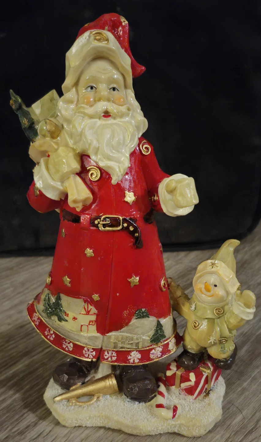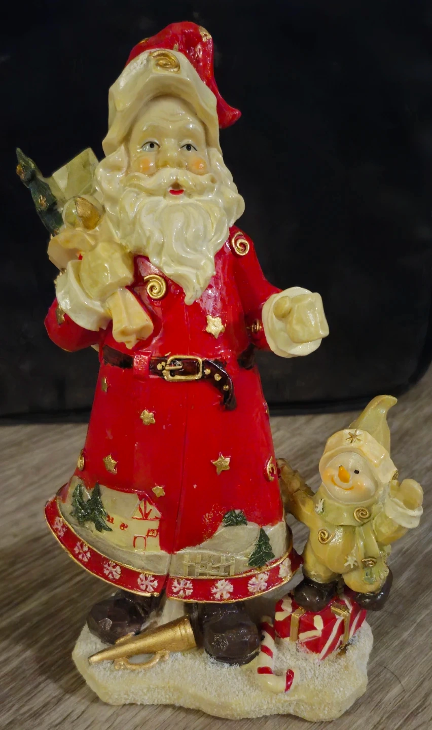 This used Christmas Santa figurine is ready to spread holiday cheer, standing tall and jovial with a sack full of presents and a friendly snowman companion. It's the perfect addition to your festive decor. Being used, it has a little wear and tear, but nothing major. Please refer to the photos for an accurate depiction of the item's condition.