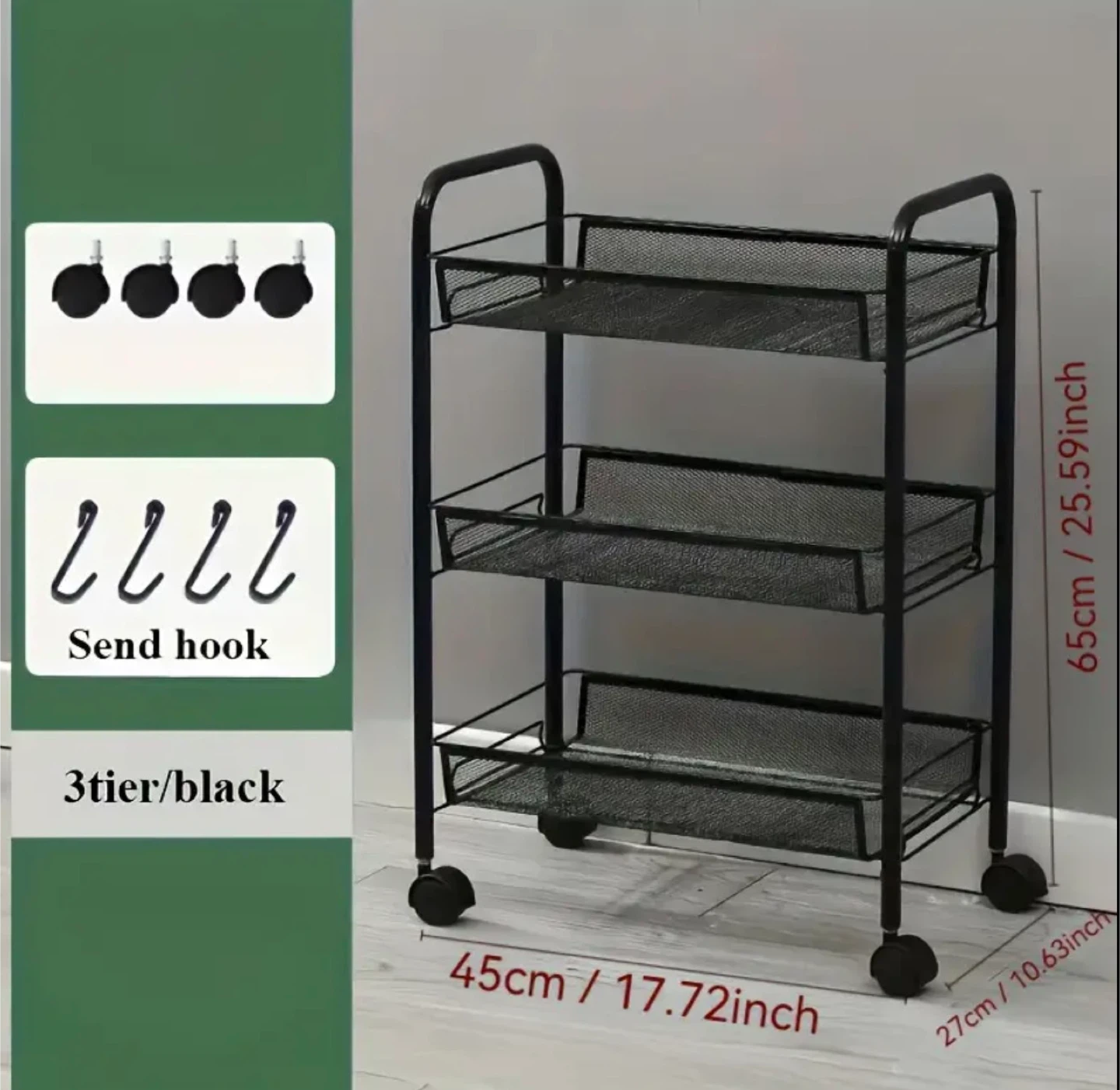 Brand new 3-tier rolling cart in black with wheels. Dimensions are mentioned in the pictures. I have 5 of them.