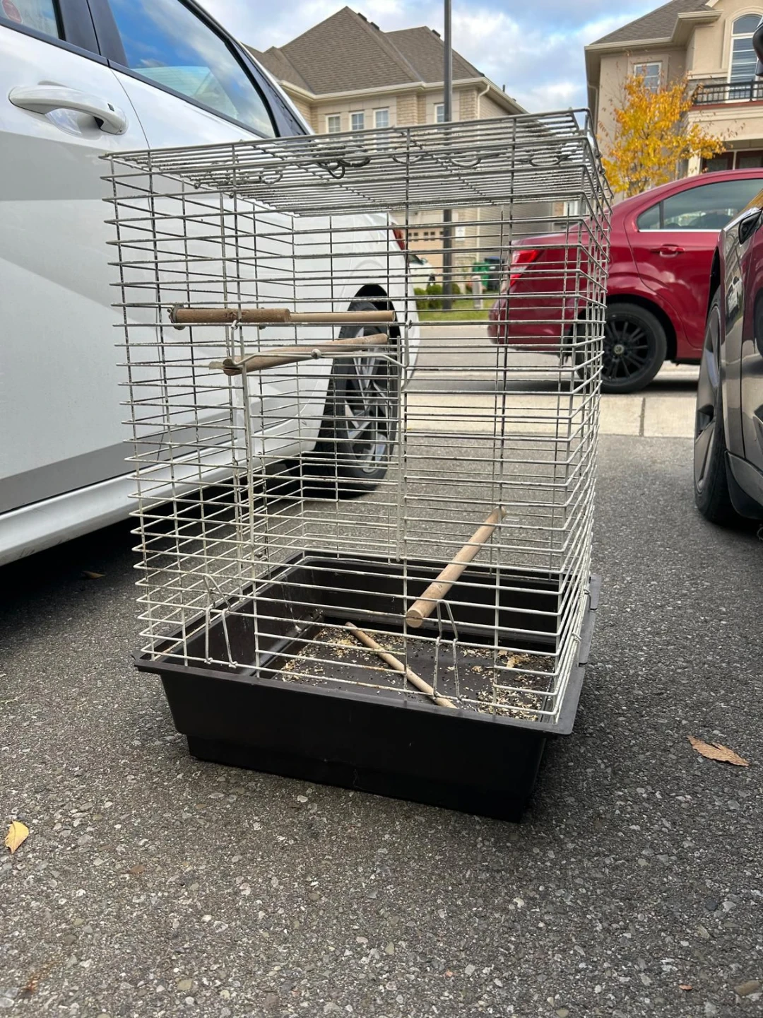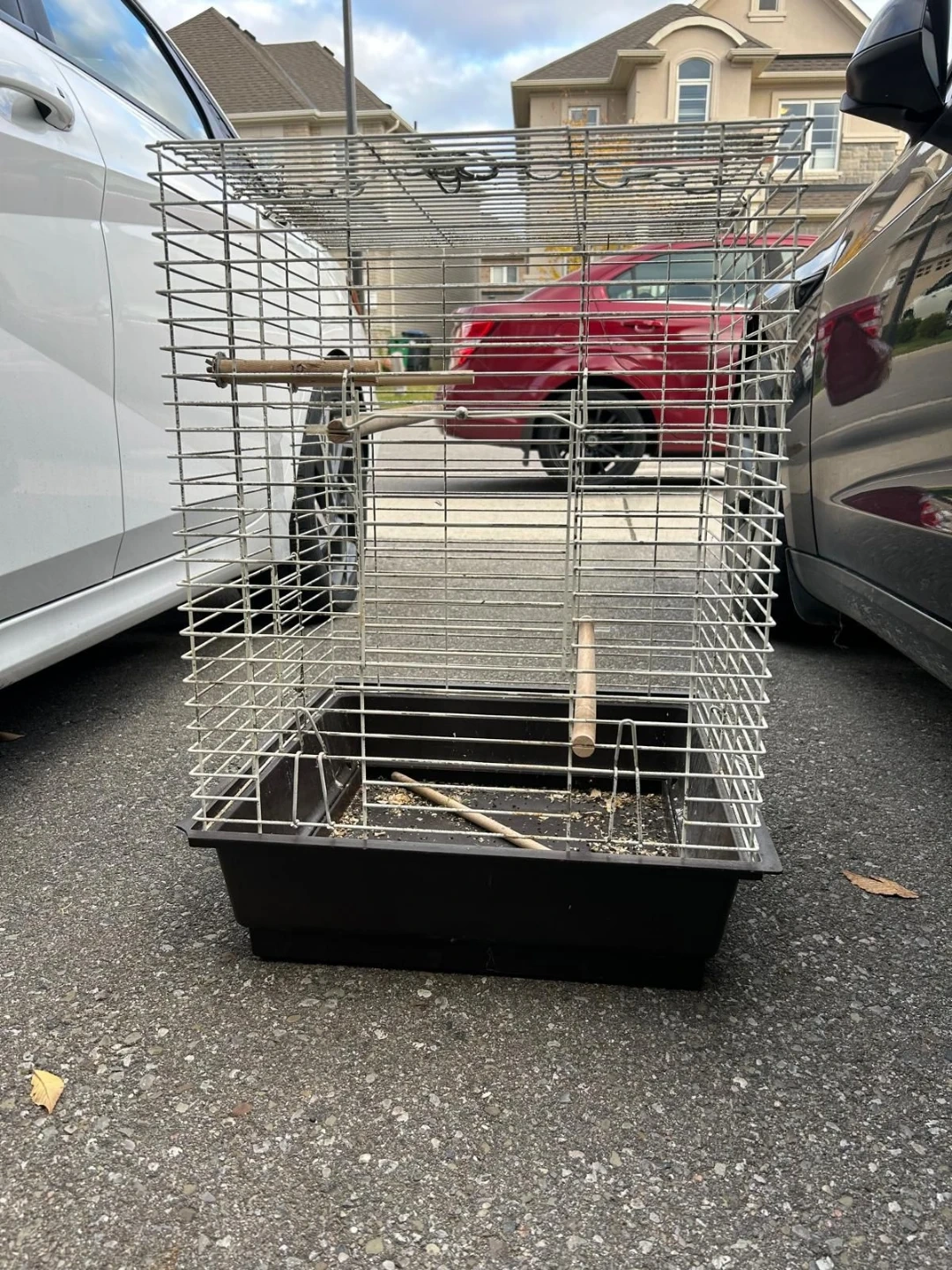 Selling a bird cage that's perfect for small birds! It comes with a black plastic base and metal wire cage. There are also a couple of wooden perches included for your feathered friend to rest on. It's in good condition and ready for a new home