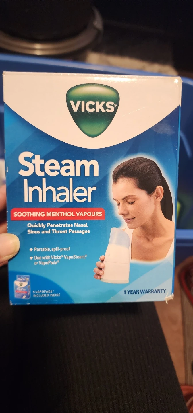 Selling a Vicks Steam Inhaler! This inhaler provides soothing menthol vapours to help quickly penetrate nasal, sinus, and throat passages. It's portable and spill-proof, and can be used with Vicks VapoSteam or VapoPads. Includes 5 VapoPads inside!