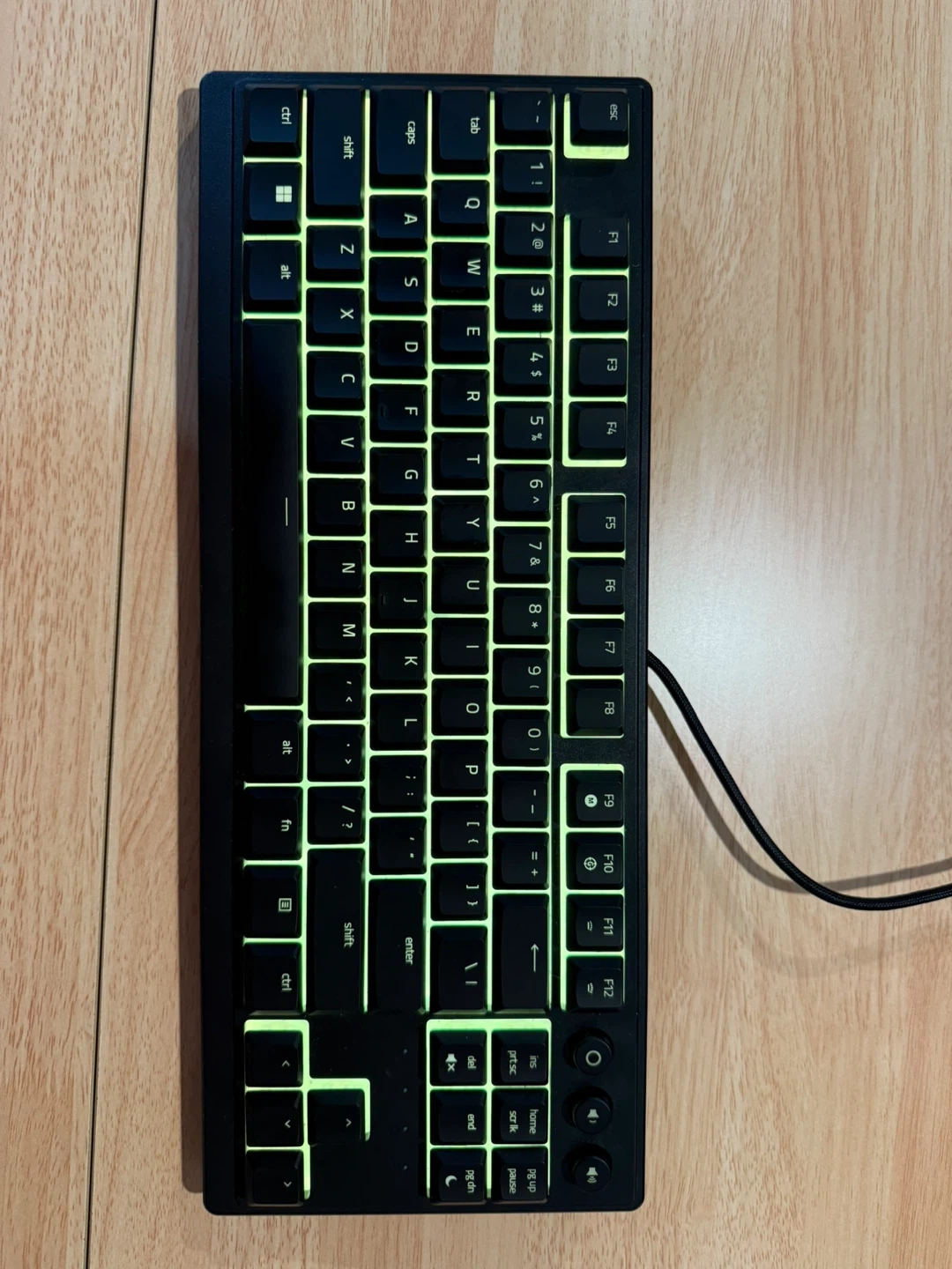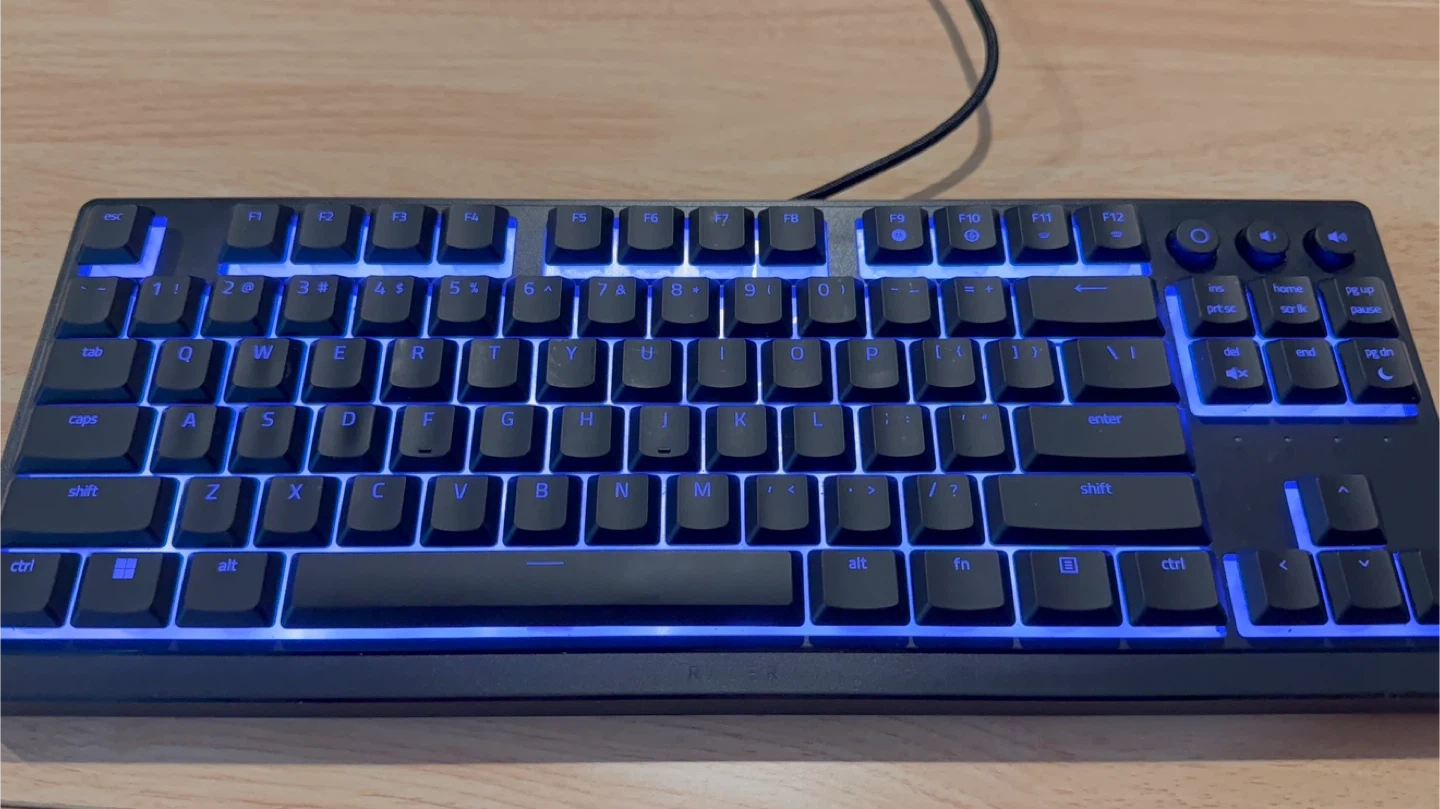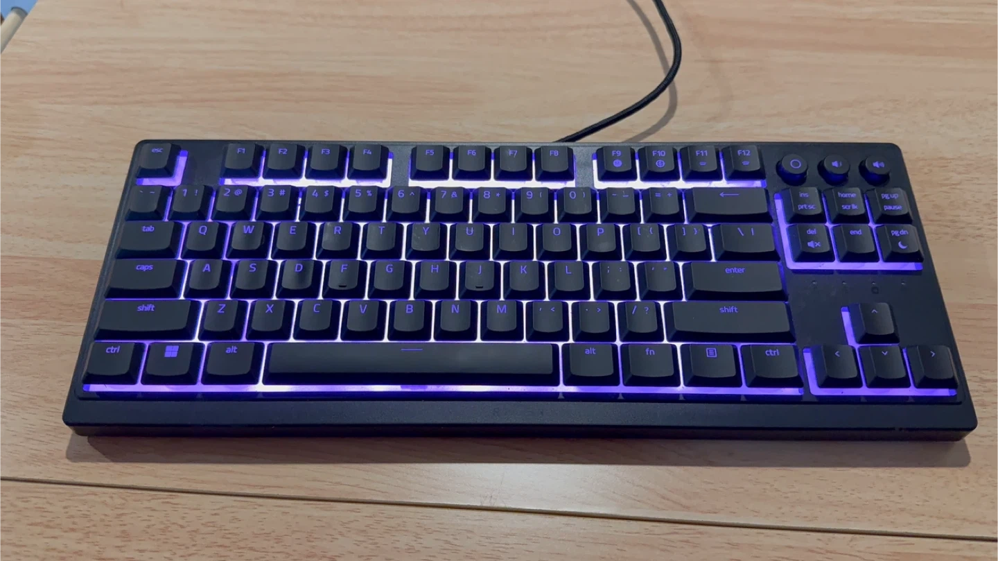 Low-profile tenkeyless design with Razer Mecha-Membrane switches, Chroma RGB (8 zones), wired USB, and UV-coated keycaps.