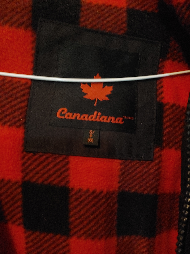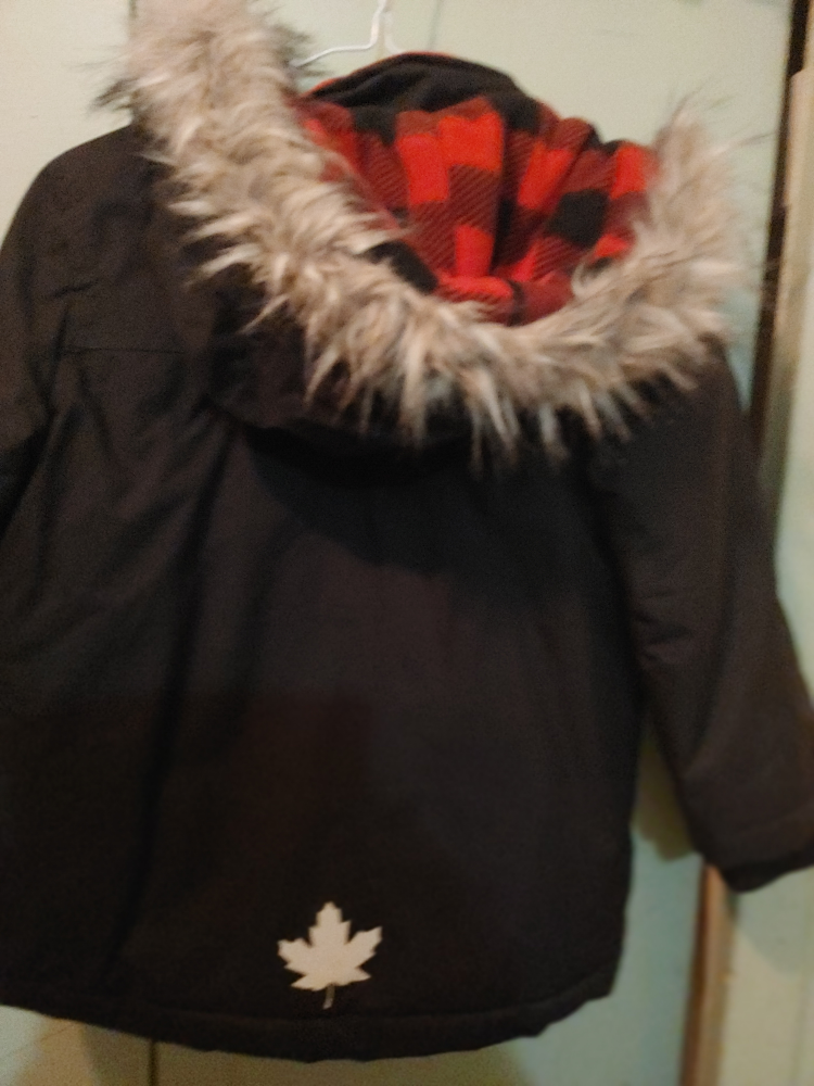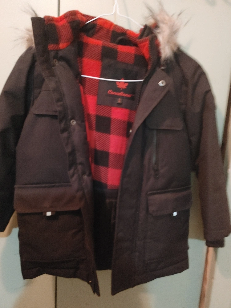 Selling a Canadiana kids' winter parka in size S (6). It's in great condition and features a warm, red and black plaid lining. Perfect for keeping your little one cozy during the cold Canadian winters!