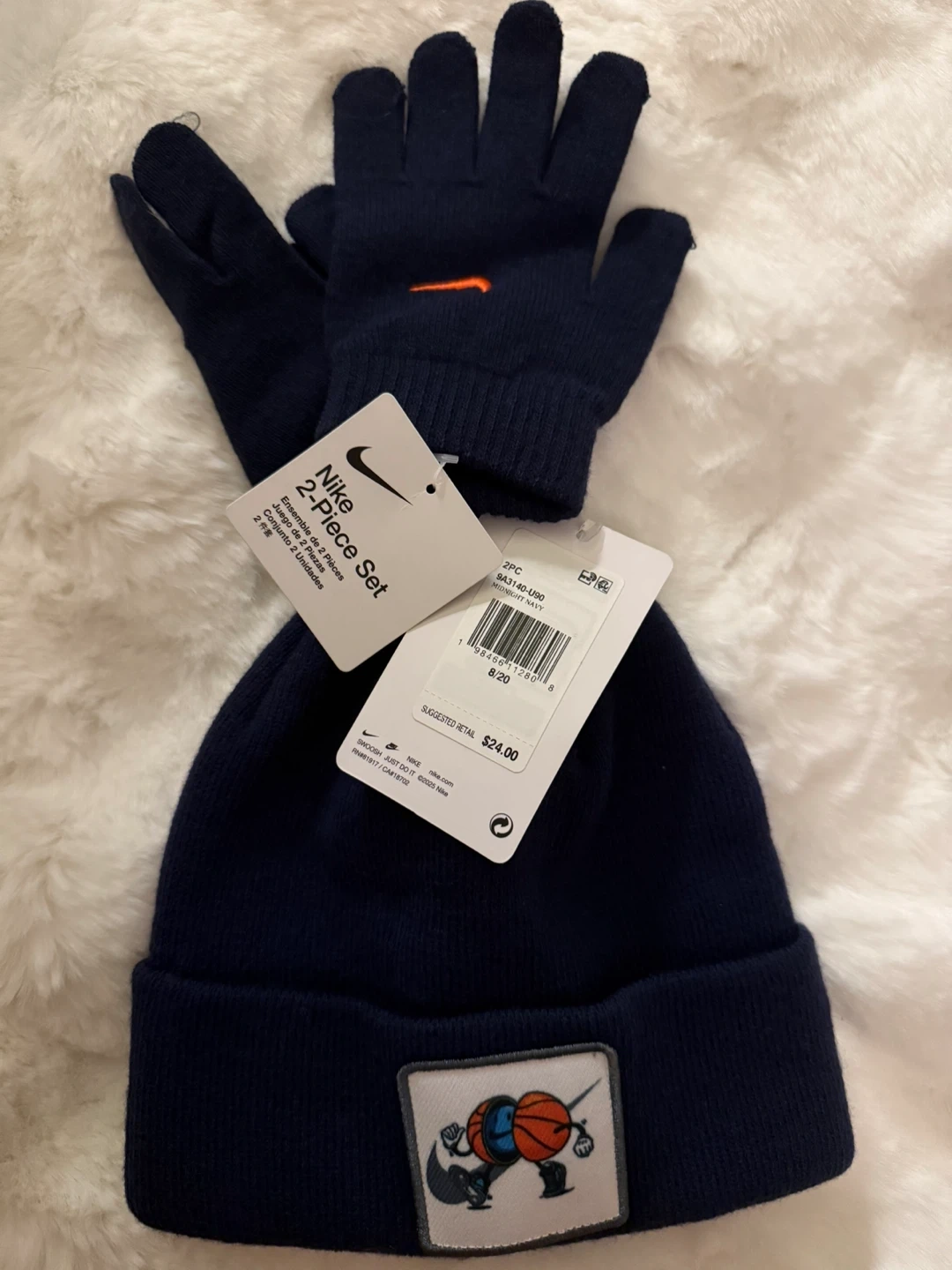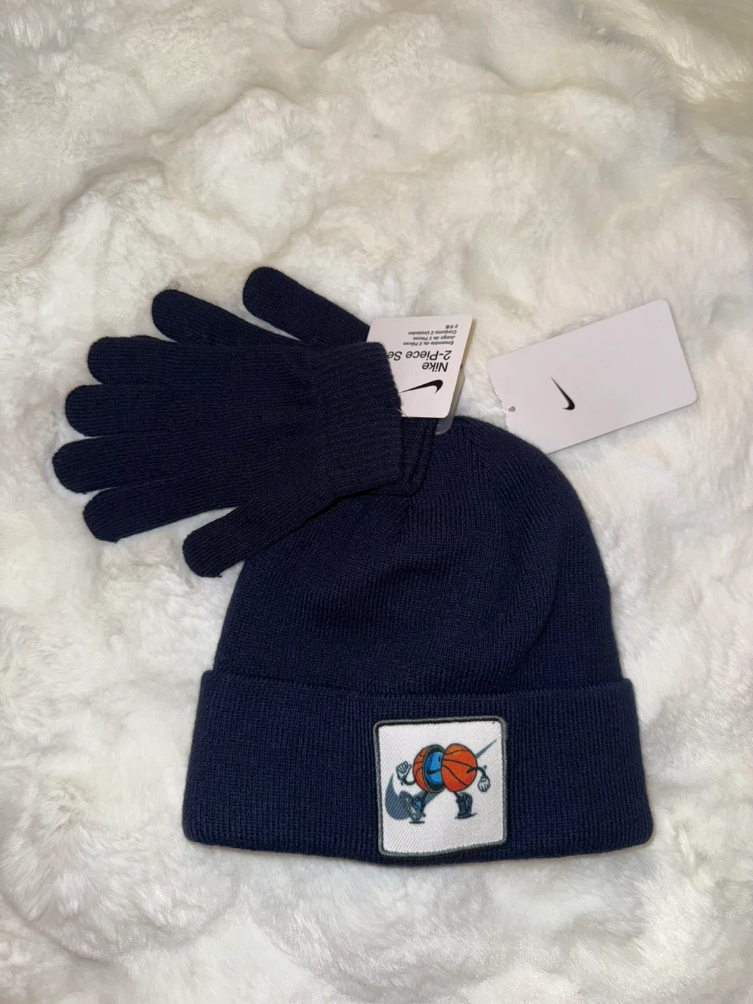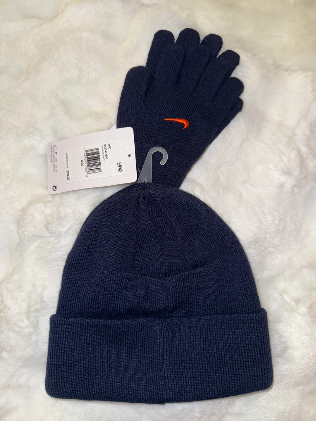 60Brand new Nike 2-piece set, including a beanie and gloves! The set is a stylish navy blue, perfect for keeping warm. The suggested retail price on the tag is $24.00. Never been worn, still with tags attached!