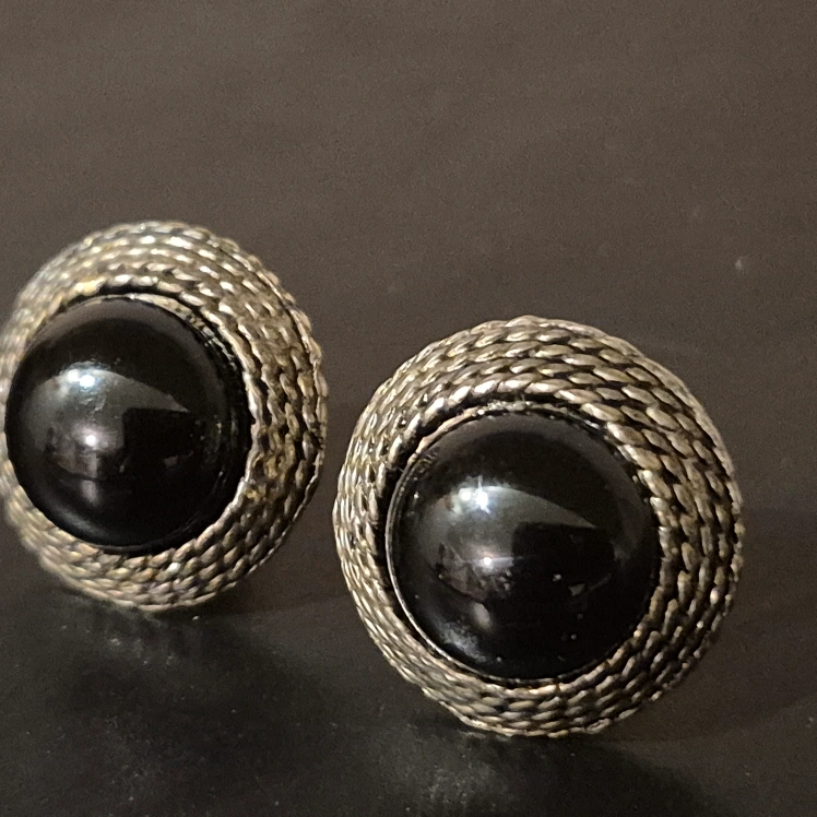 Selling a pair of vintage-style stud earrings! They feature a round black centre stone surrounded by a rope like textured silver-tone metal setting. Perfect for adding a touch of retro charm to any outfit. Selling for $10. Pick up this lovely set in Hanover ON. Porch pick up with etransfer @ your own convenience, or cash upon arrival + no contact sale