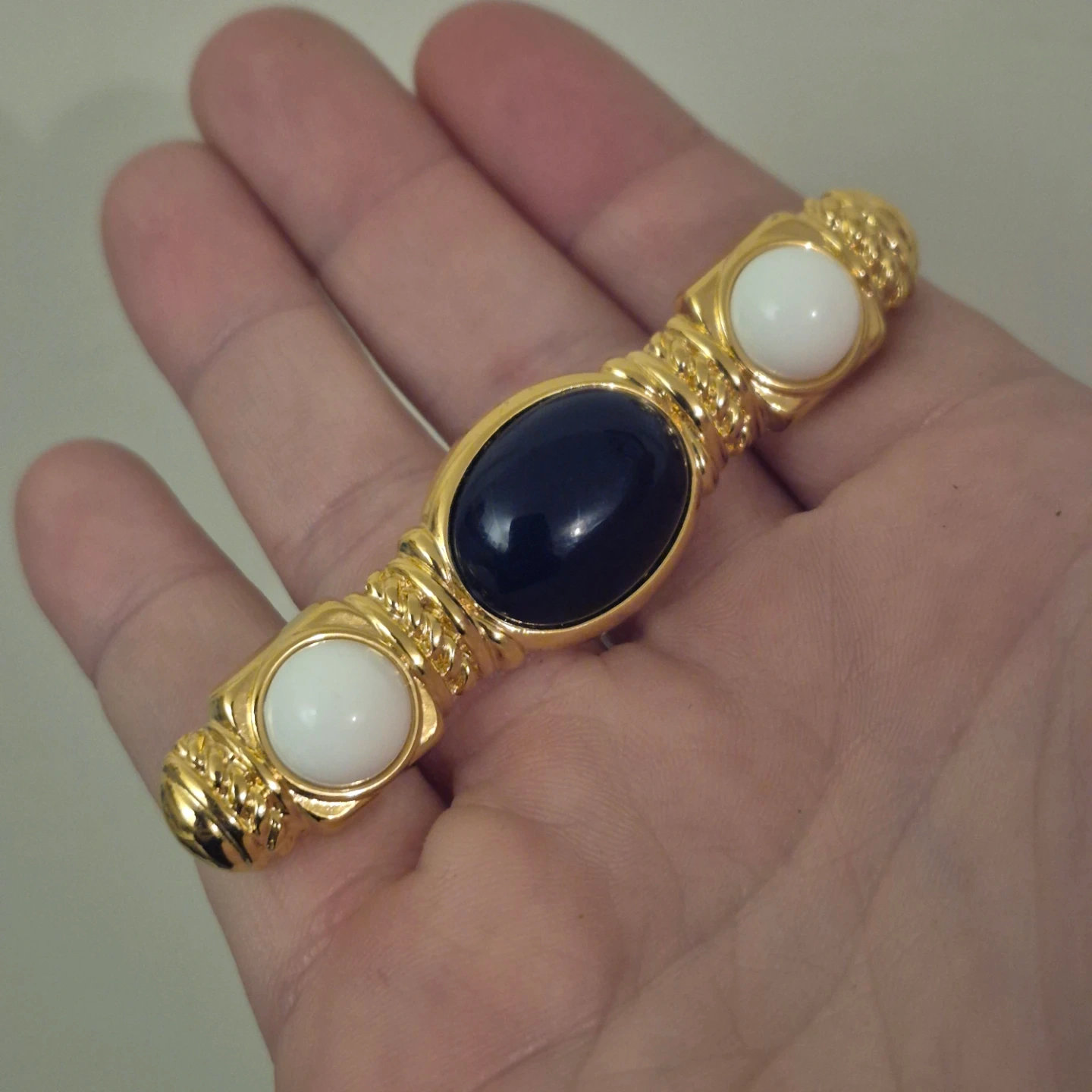 Selling a vintage MONET Etruscan Revival Bar Brooch. It features a gold tone metal with navy blue and white cabochons. The domed cabs are made of Lucite with a large oval in the center and a smaller round one on either side. The metal has nice rope-like detail. The back of this designer pin is signed MONET, preceded by the copyright symbol. It was probably made in the 1980s - VINTAGE.
