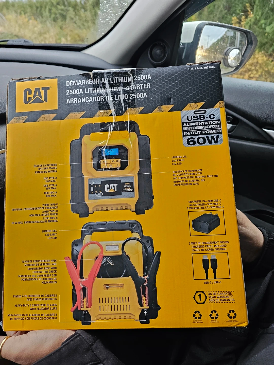 Selling a brand new CAT 2500A Lithium Jump Starter, still in its original box! This powerful jump starter is perfect for emergencies and provides reliable power when you need it most. It features a USB-C port for input/output with 60W power, and also has a USB-A port. The box includes the charging cable.