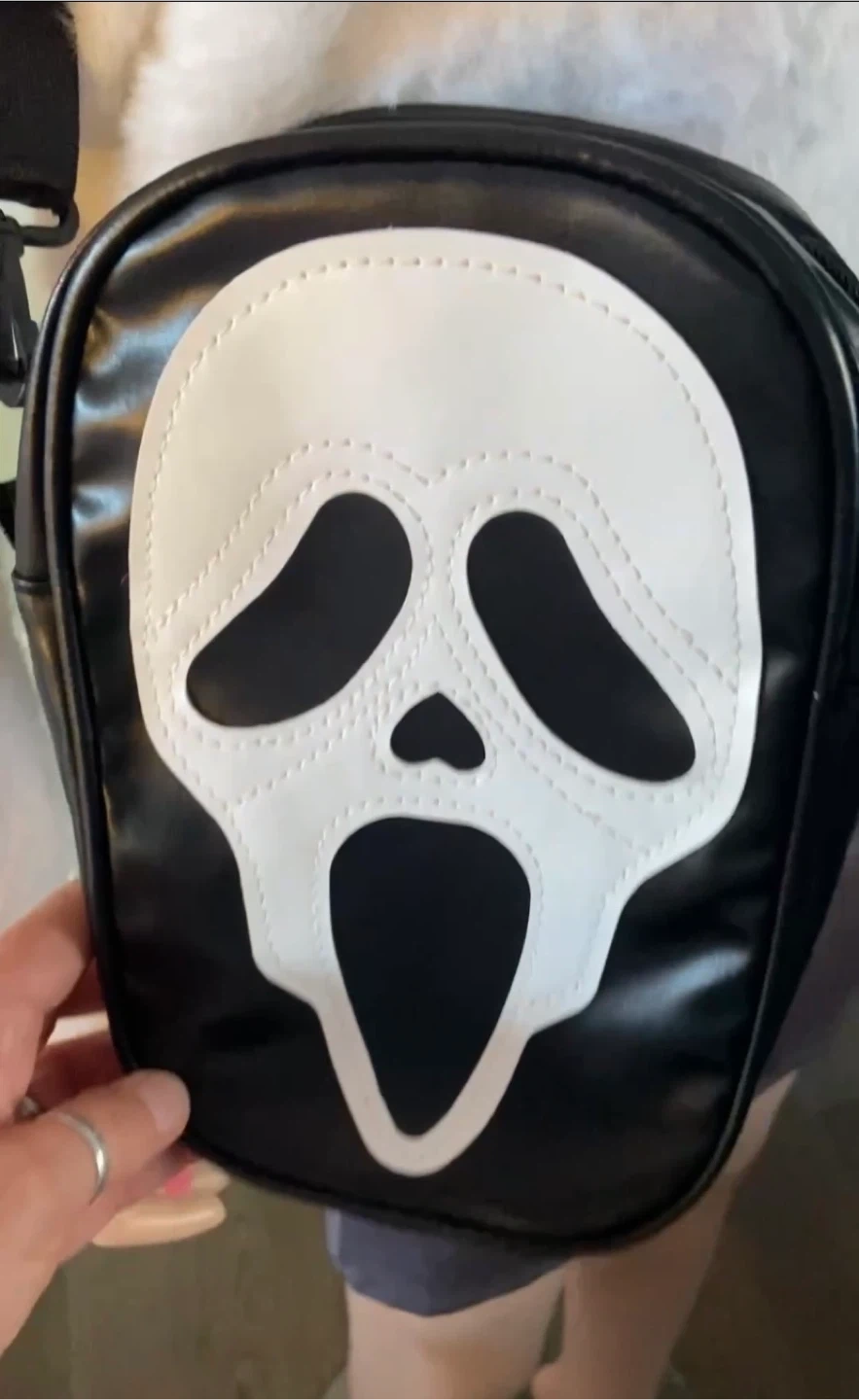 Cute Scream Ghostface crossbody bag! Perfect for any horror fan. The bag is black with a white Ghostface design on the front. It has a black adjustable strap. New and smk-free