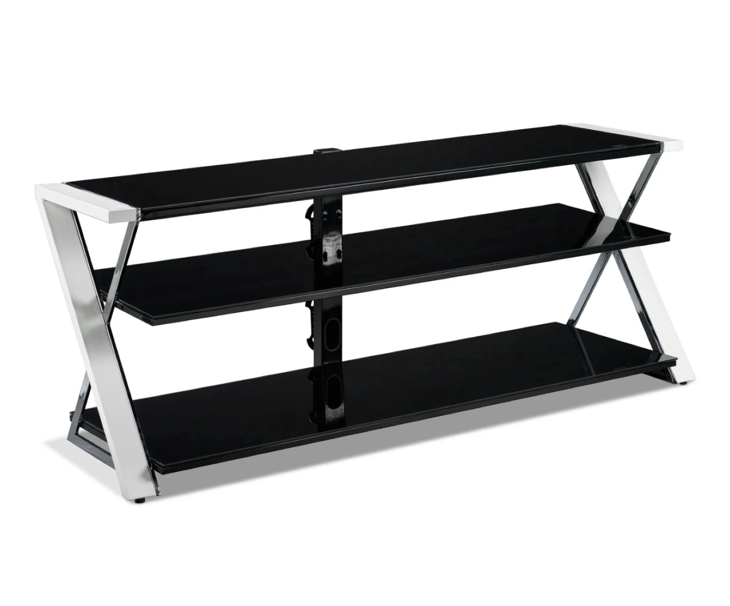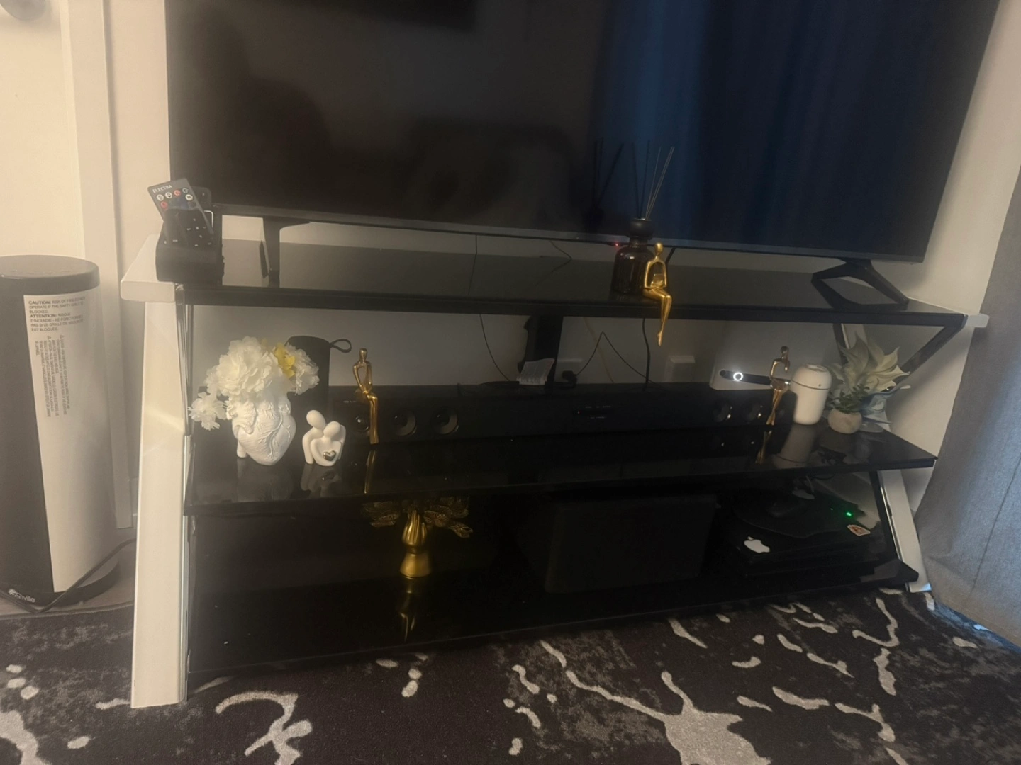 Selling a modern black and white TV stand! It's in great shape and would look fantastic in any living room. It features a sleek design with glass shelves and a sturdy frame. Perfect for organizing your media devices and adding a touch of style to your space