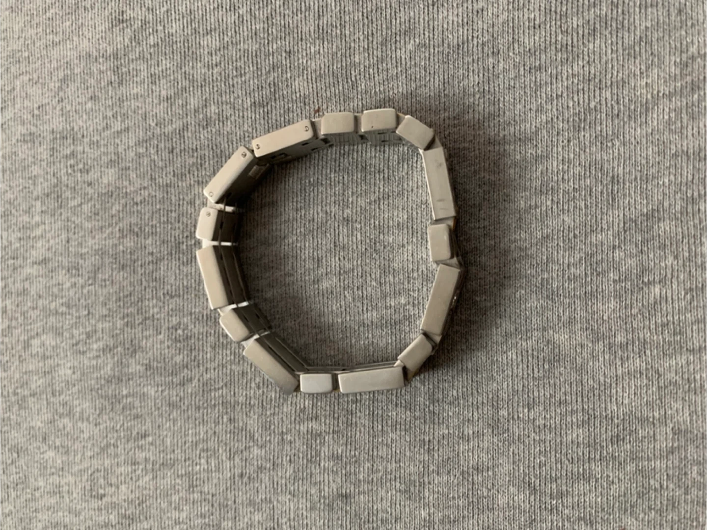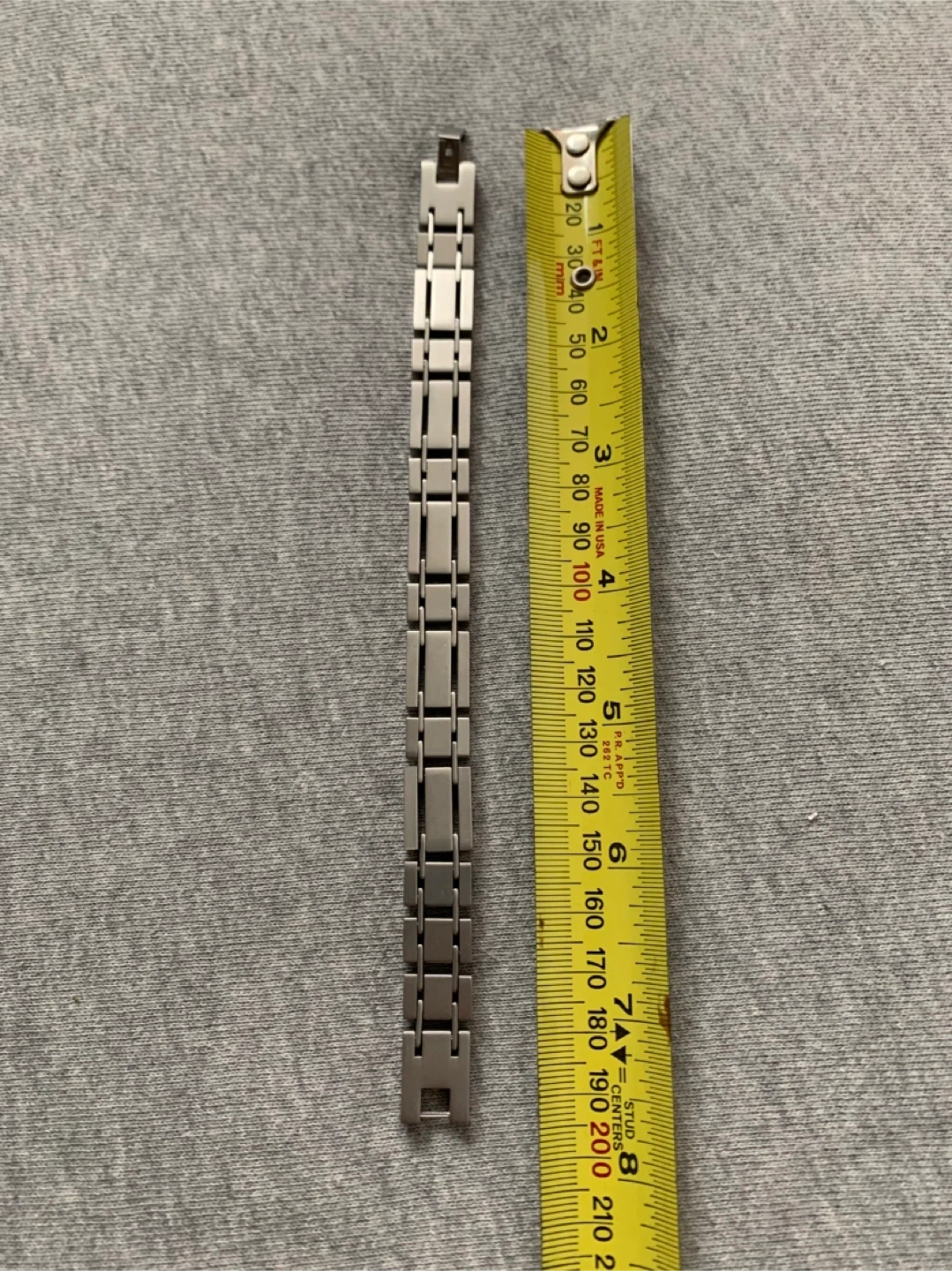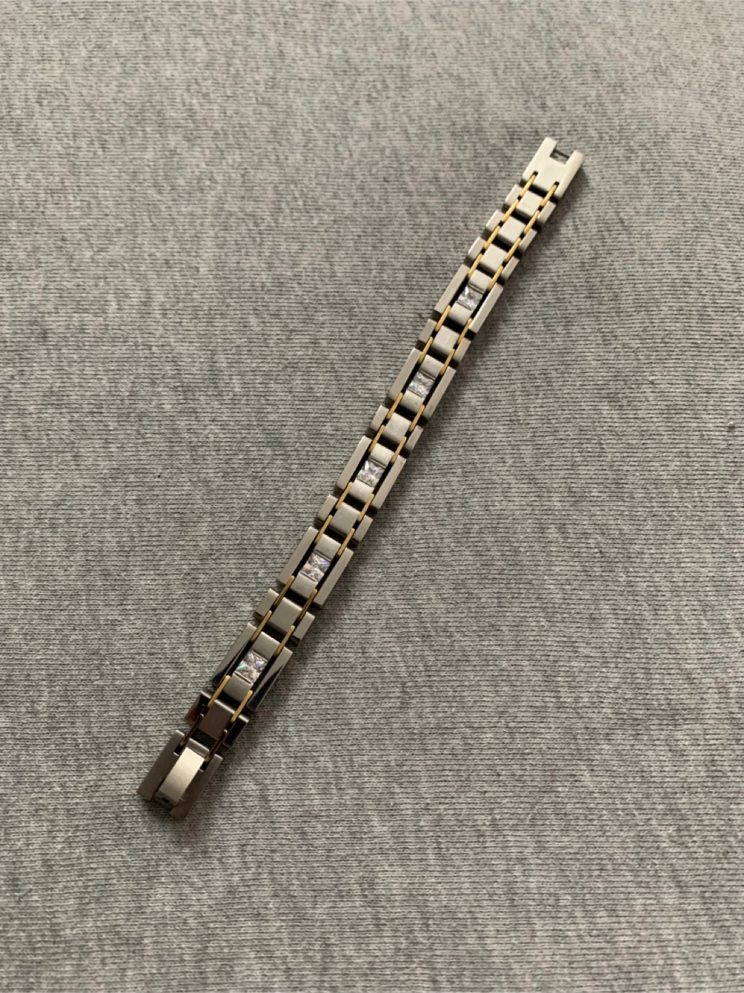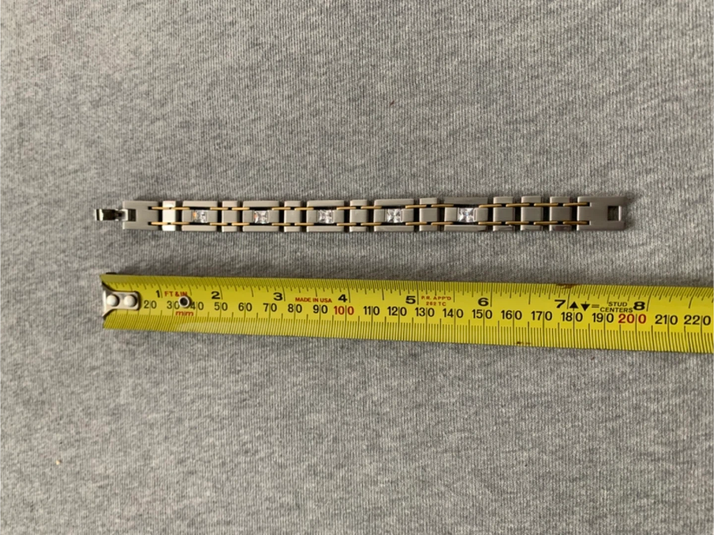 1000+It's silver in colour with some inset diamond like stones and slight gold accents. Approximately 8 inches in length