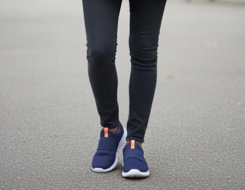 Aldi's brand: Crane ladies memory foam shoes in size 10. These shoes are a stylish and comfortable choice for everyday wear. They feature a navy blue mesh upper with orange accents, a white sole, and a convenient slip-on design with a wide elastic strap. The memory foam insole provides cushioning and support for all-day comfort.