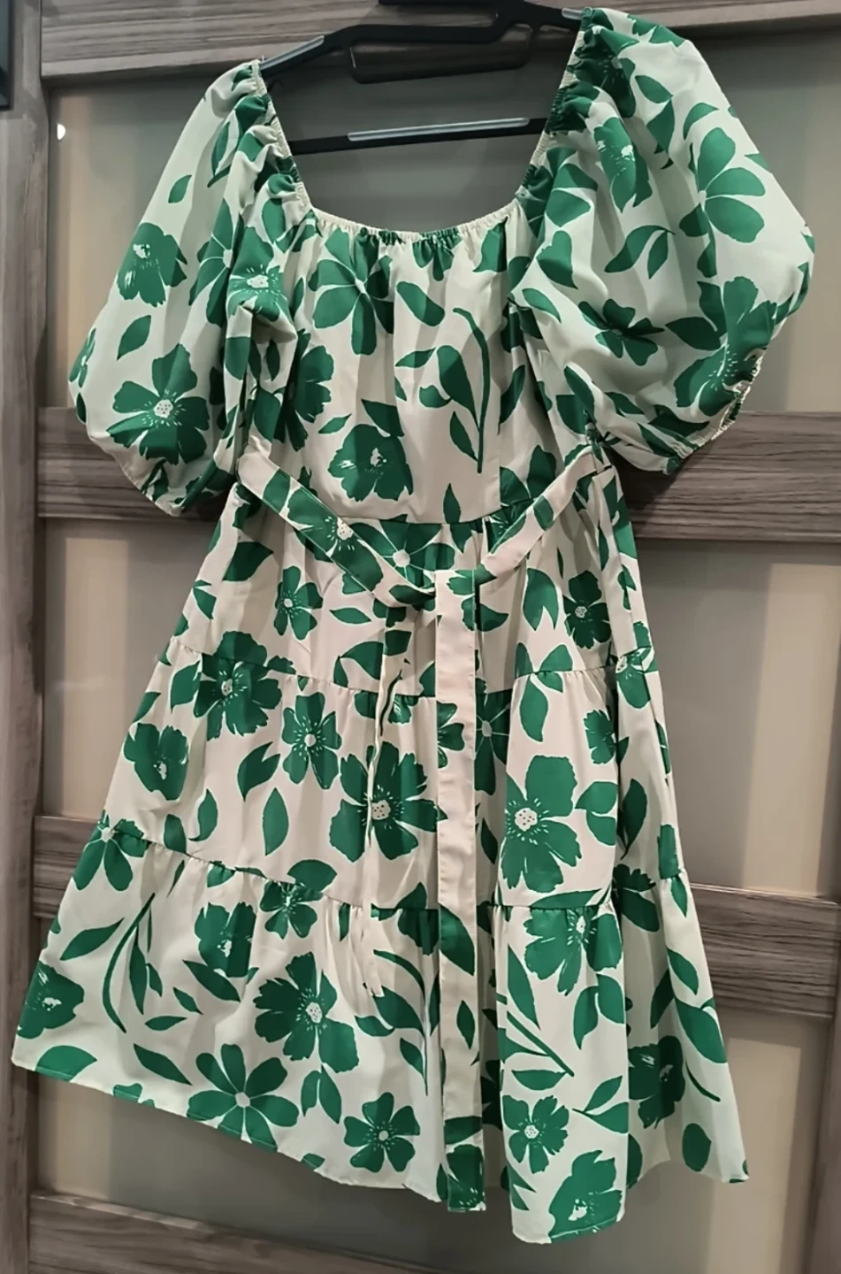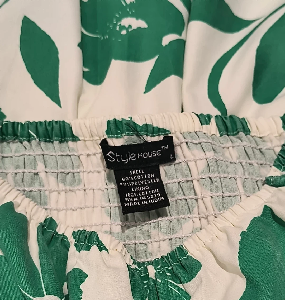Selling a cute Style House dress with a green floral pattern! It's a size large and made of 60% cotton and 40% polyester for the shell, with a 100% cotton lining. Perfect for a sunny day!