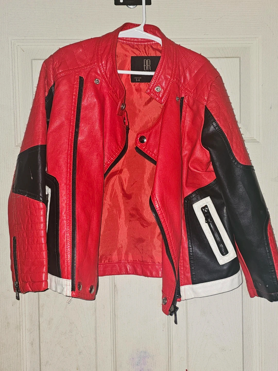 Here's a cool red and black leather jacket, perfect for a kiddo! It's size 5-6 and has a stylish design with zipper details on the sleeves. The jacket is in great condition and ready for a new home